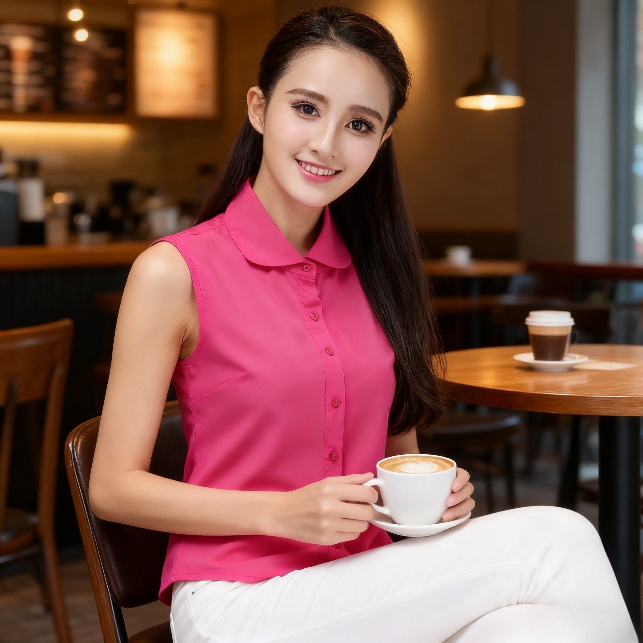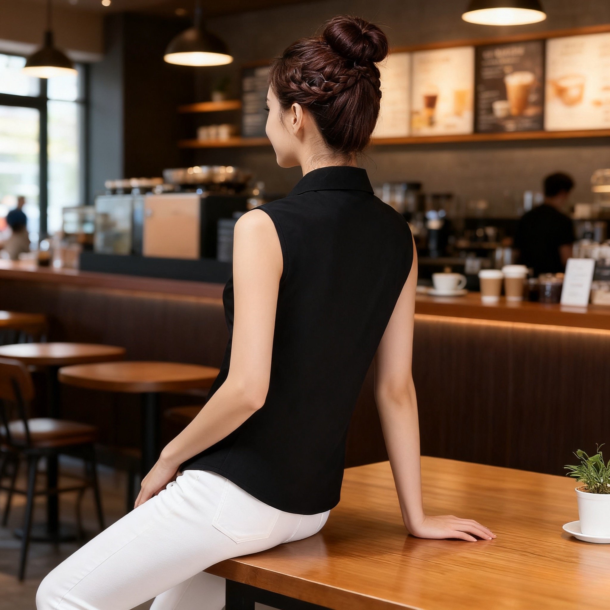 2025夏秋女式尖领无袖衬衫百搭修身显瘦雪纺纯色翻领职业打底衬衣