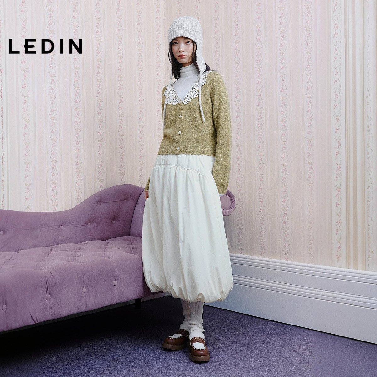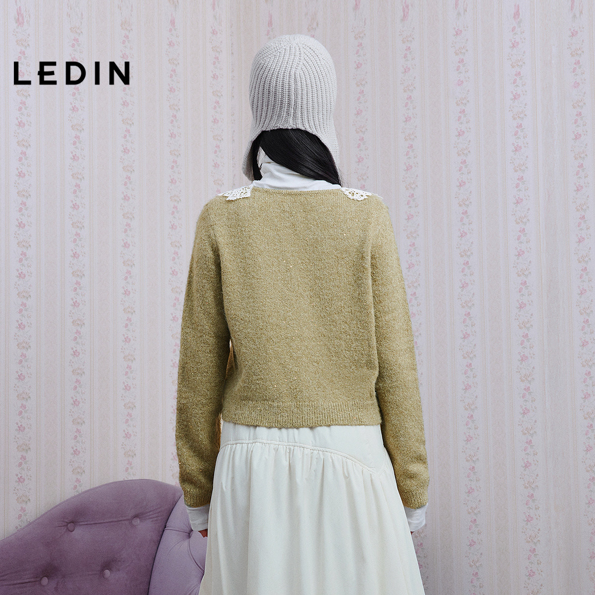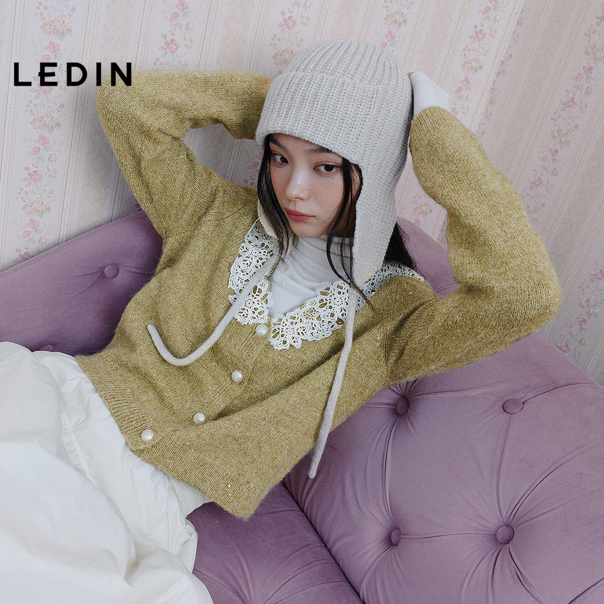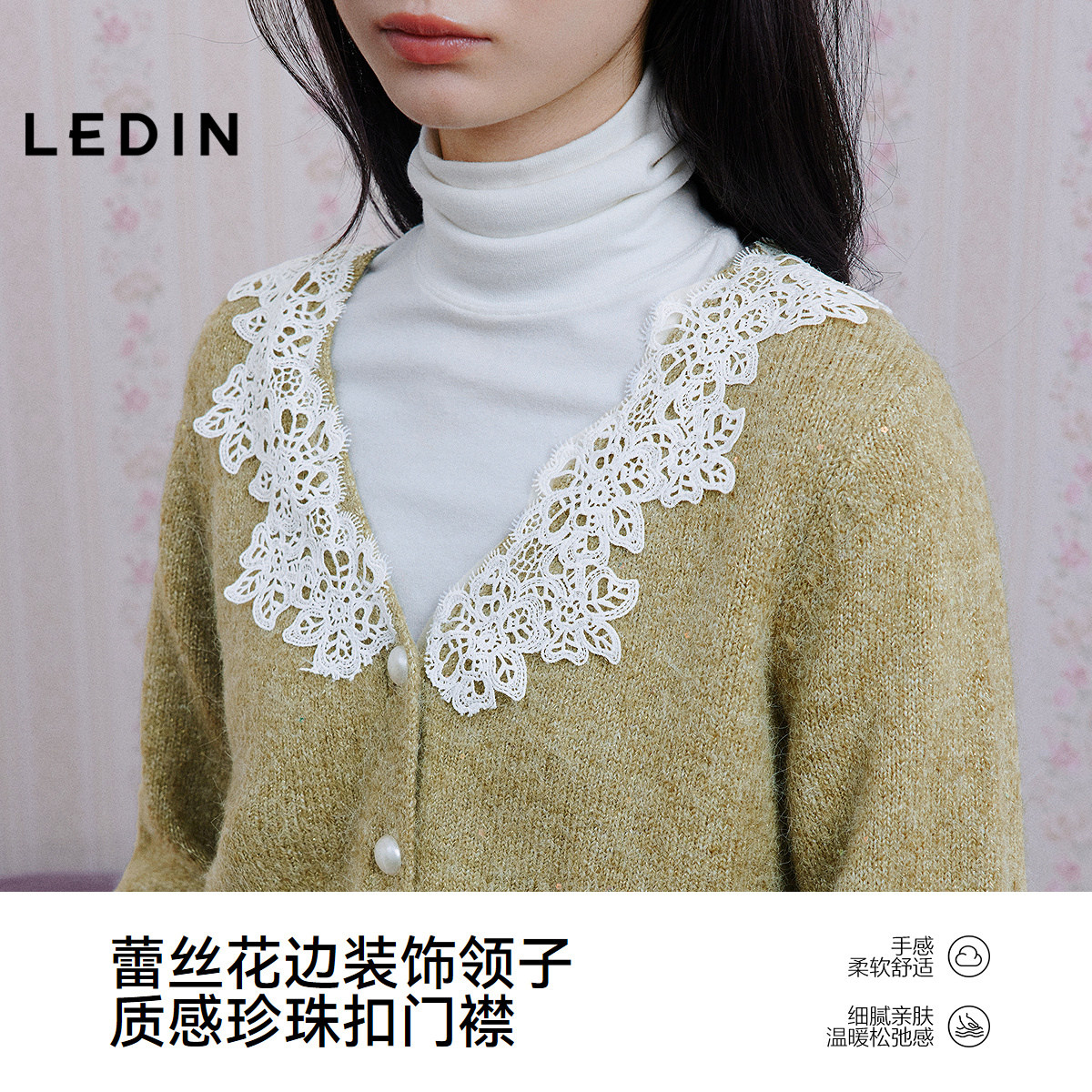 乐町韩系甜美蕾丝领毛针织衫冬季新款氛围感正肩外套V领毛衣开衫