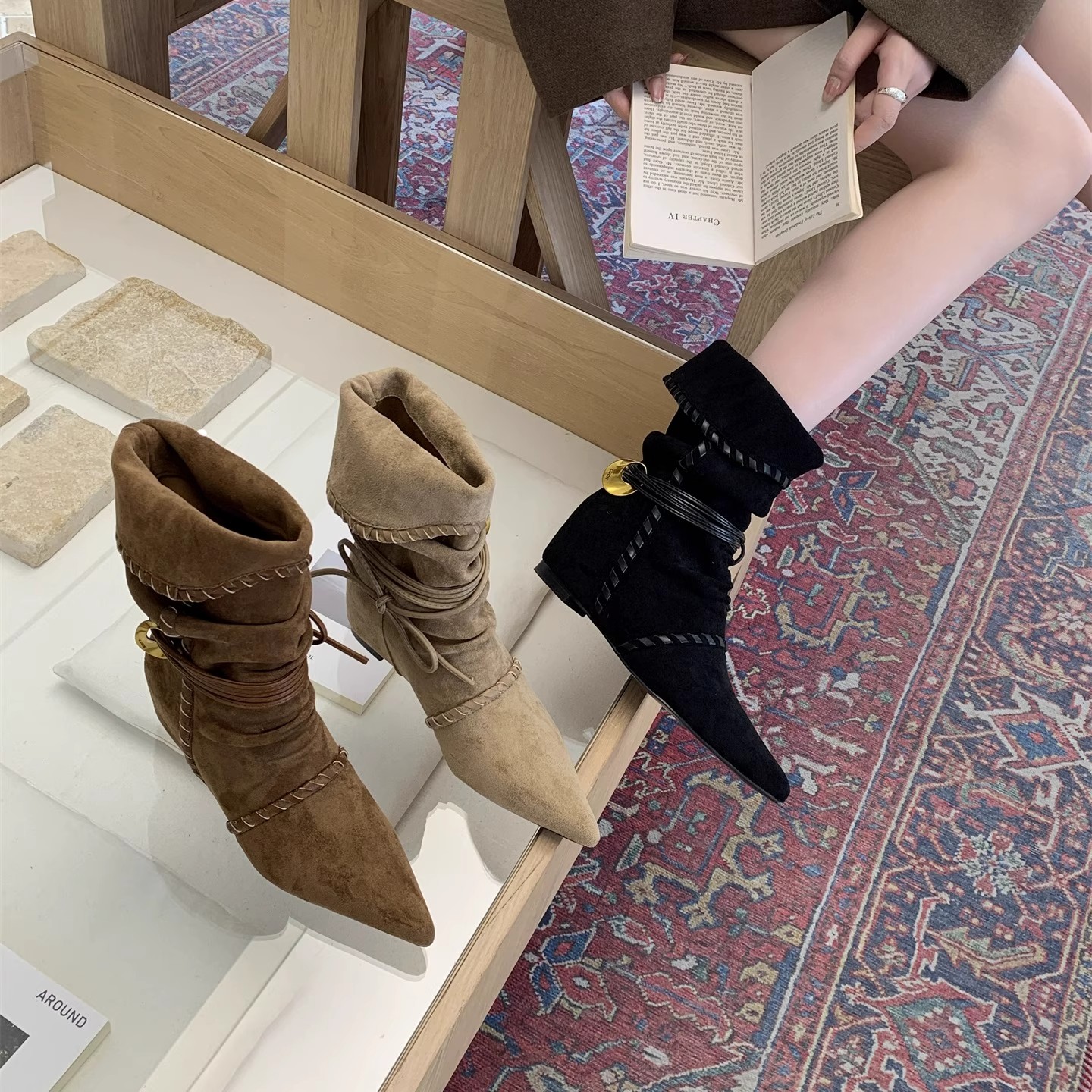 内增高尖头绒面瘦瘦中筒骑士靴女靴子秋冬季新款西部牛仔堆堆长靴