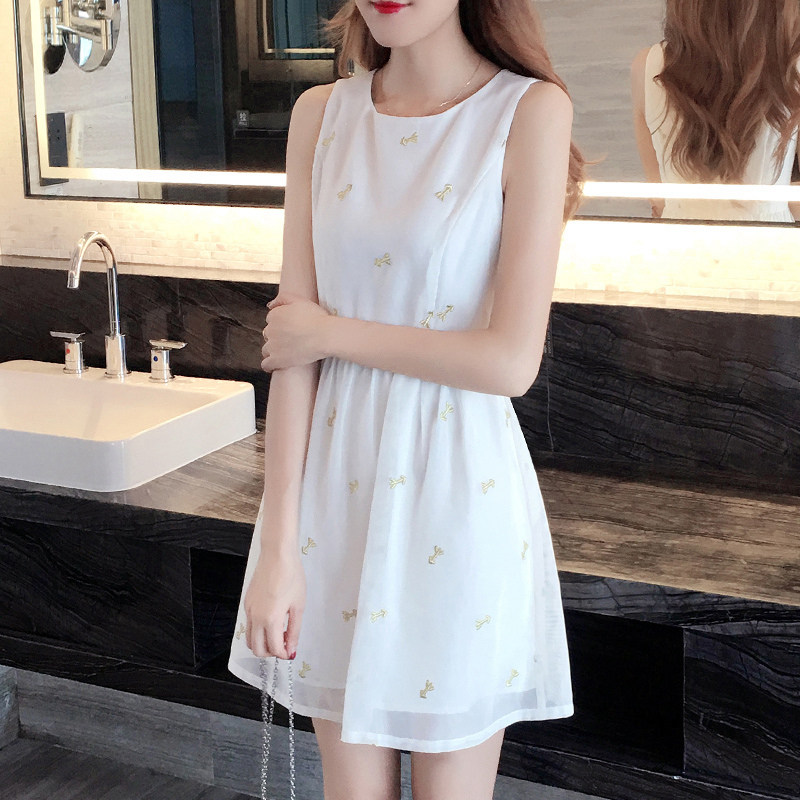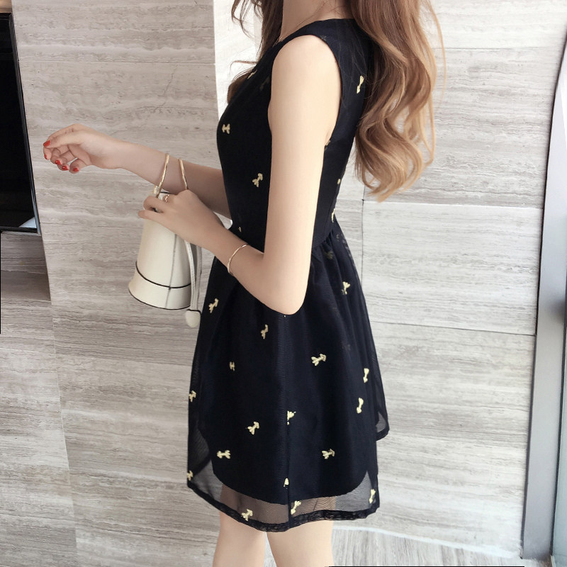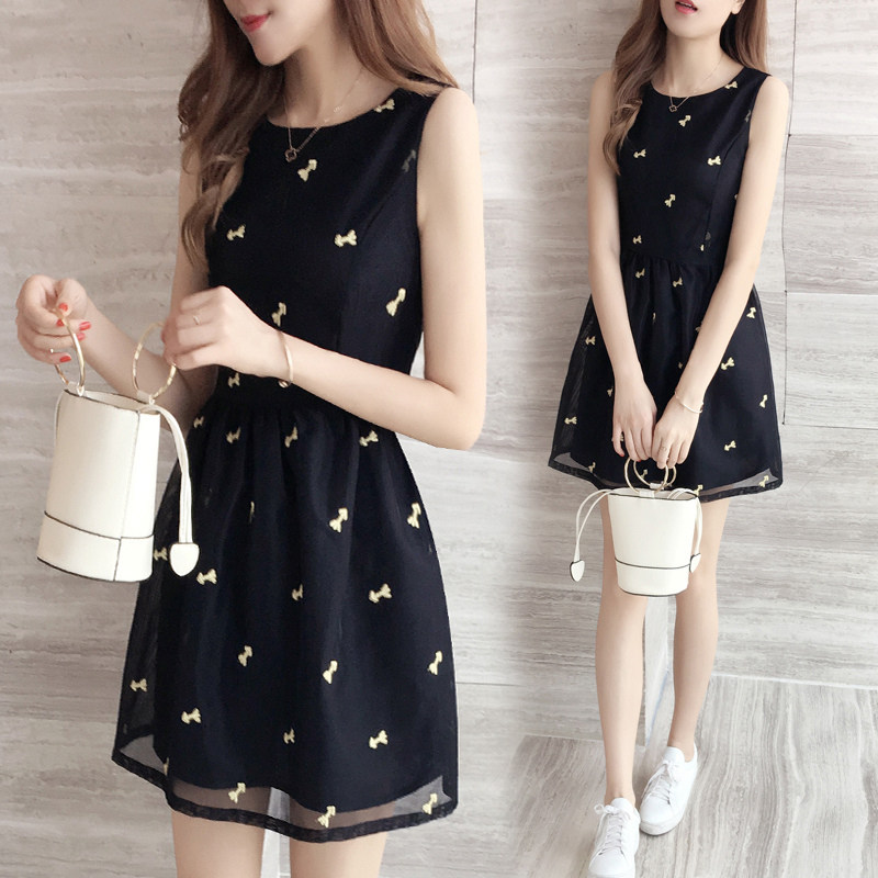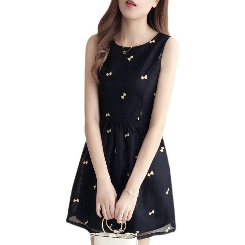欧根纱连衣裙2024新款女夏季小个子无袖背心裙气质黑色碎花a字裙