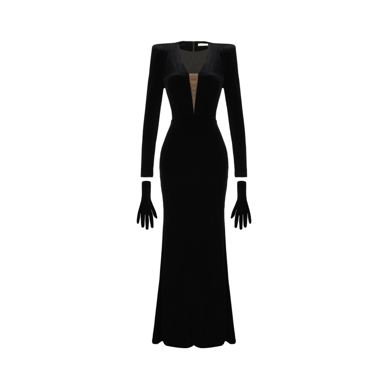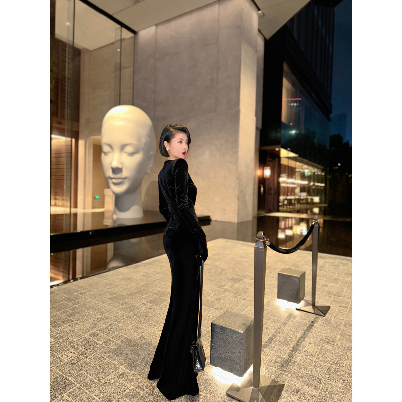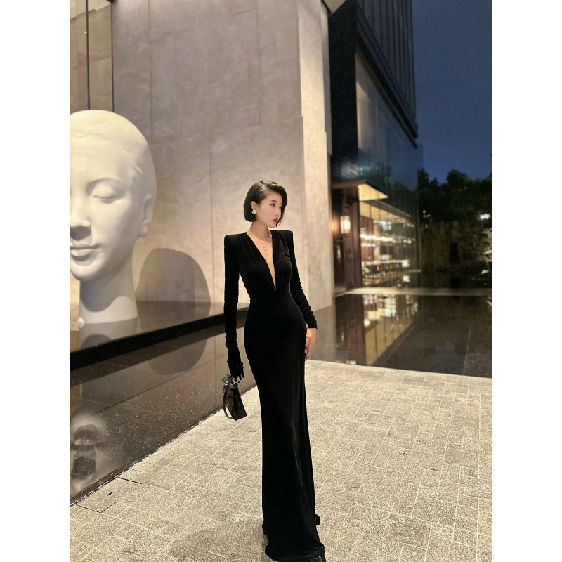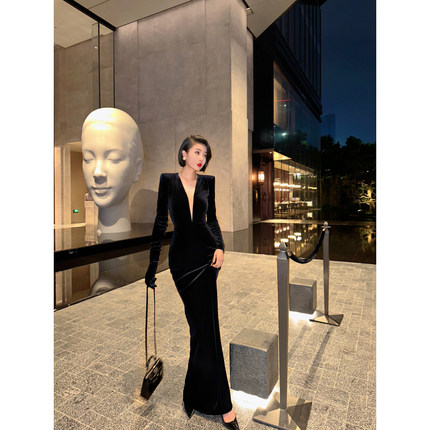 XULU原创新款丝绒小众高阶赫本风优雅深V领长袖显瘦高腰连衣裙