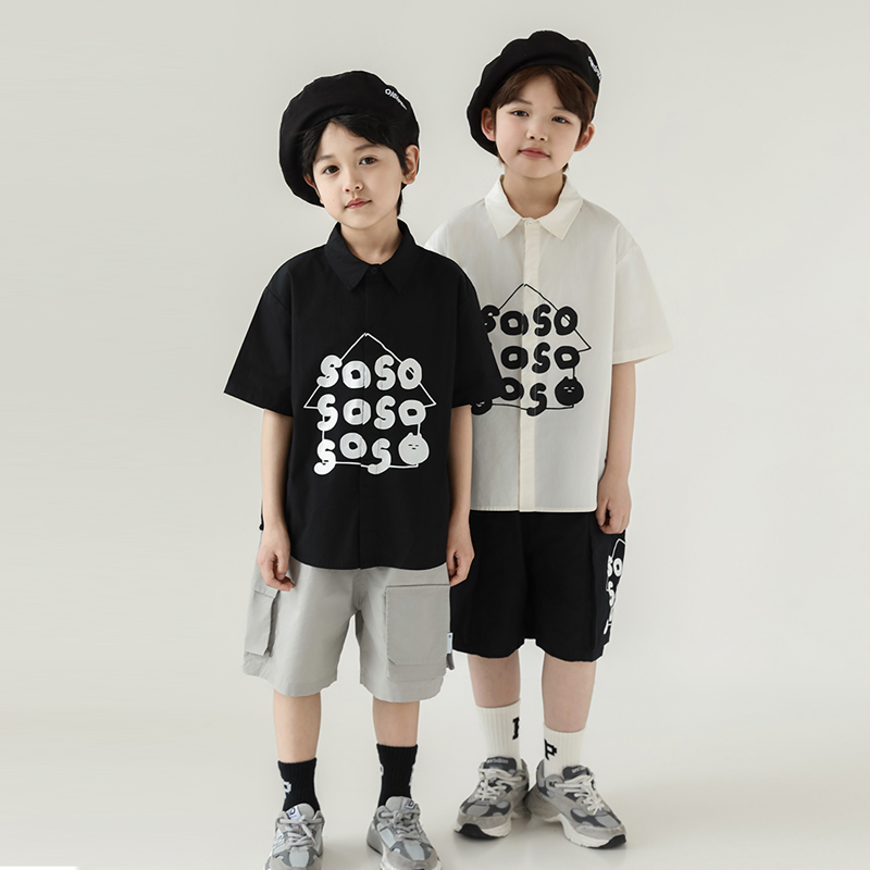 oddtails男童纯棉印花衬衫短袖2025年新款中大童字母印花潮牌夏装