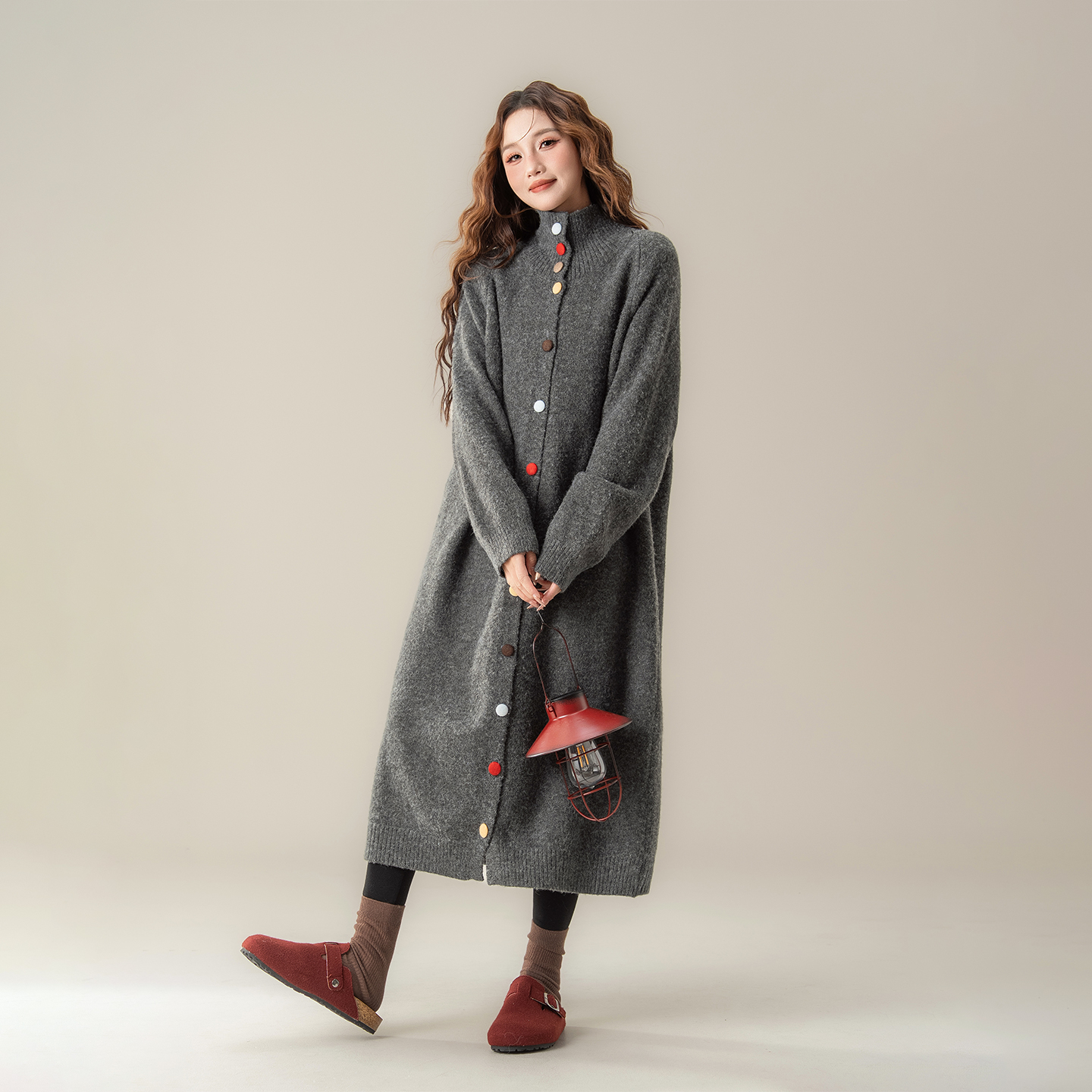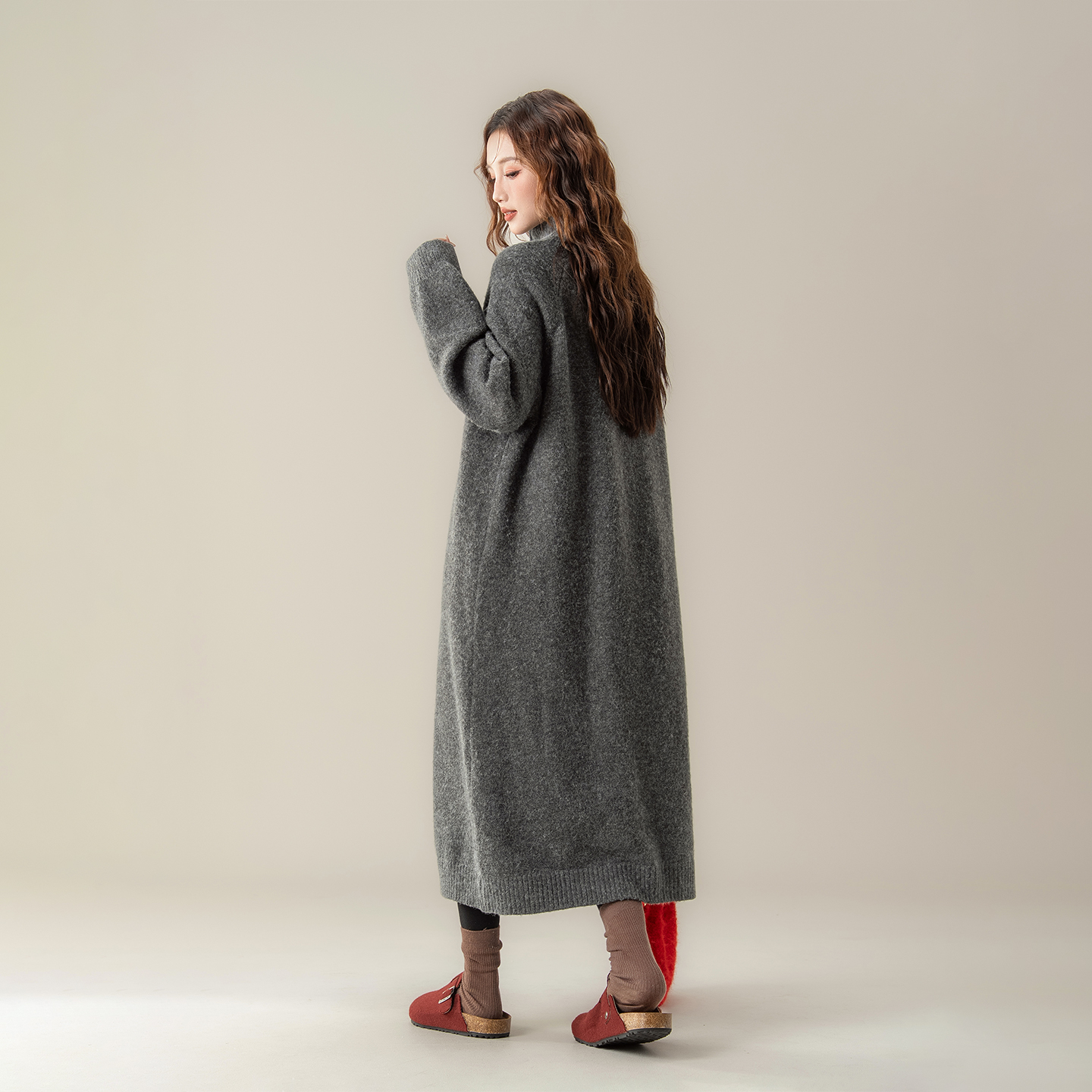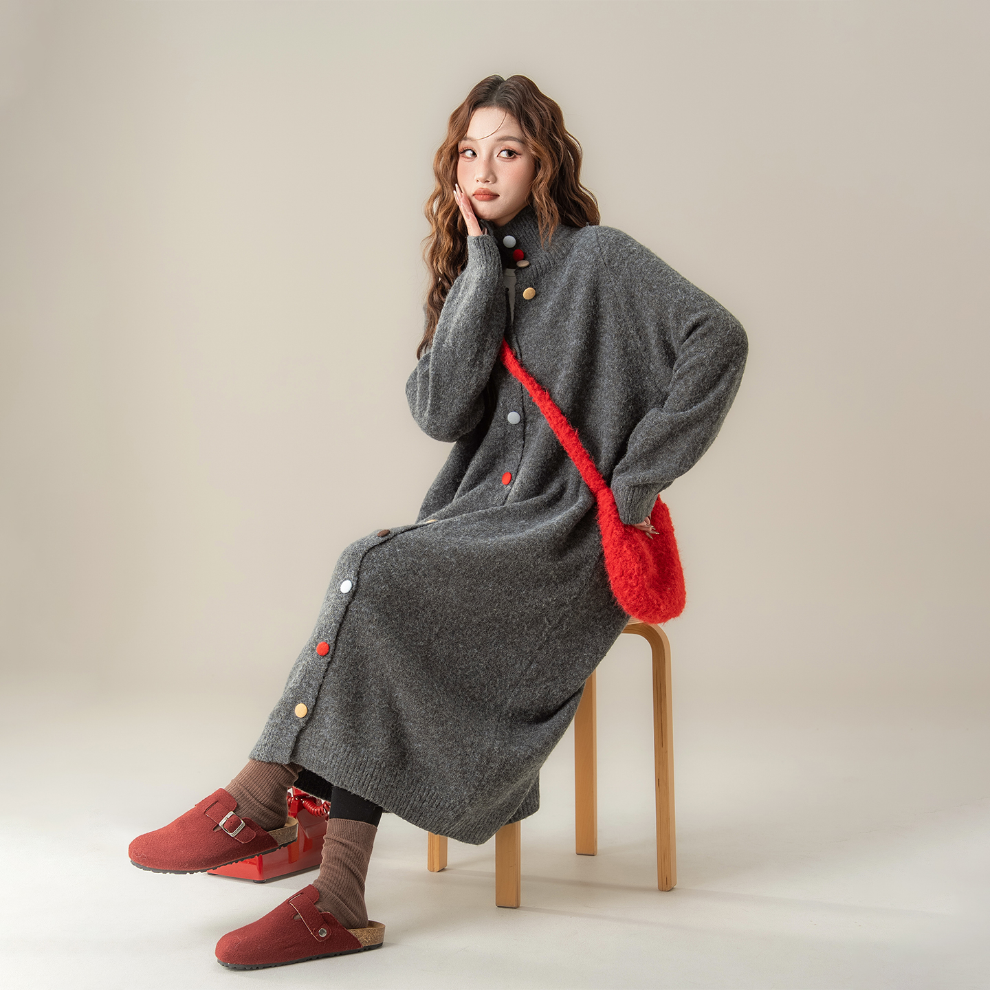 韩系温柔彩扣半高领针织开衫女2025秋冬新款慵懒风宽松连衣裙长裙