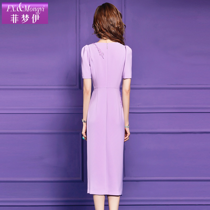 菲梦伊紫色钉珠连衣裙女夏装独特漂亮轻熟气质修身开叉职业一步裙
