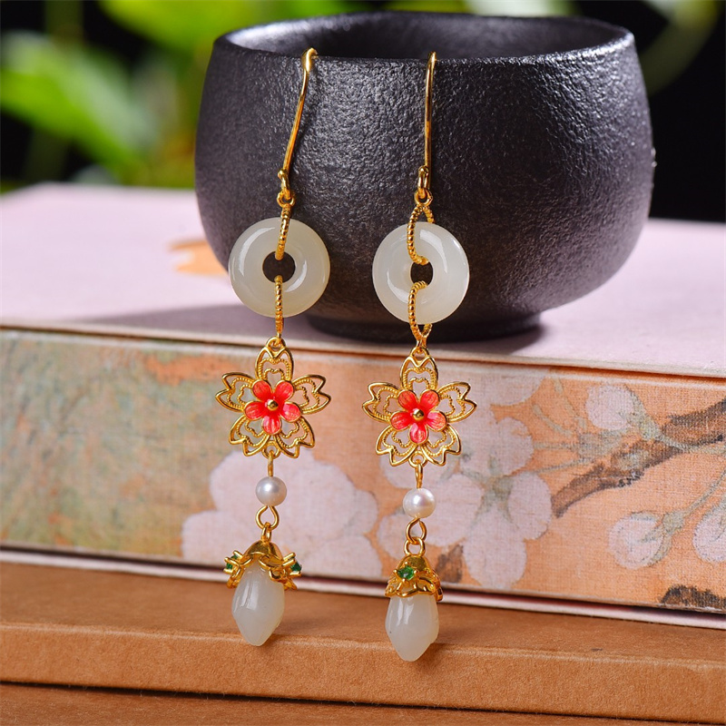 天然和田玉平安环配玉兰花珐琅耳坠S925银镶嵌白玉中国风饰品礼物