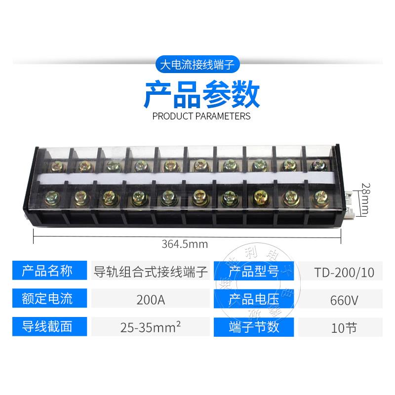 接线端子排导轨组合接线排TD-20010大电流电线连接器10位铜200A