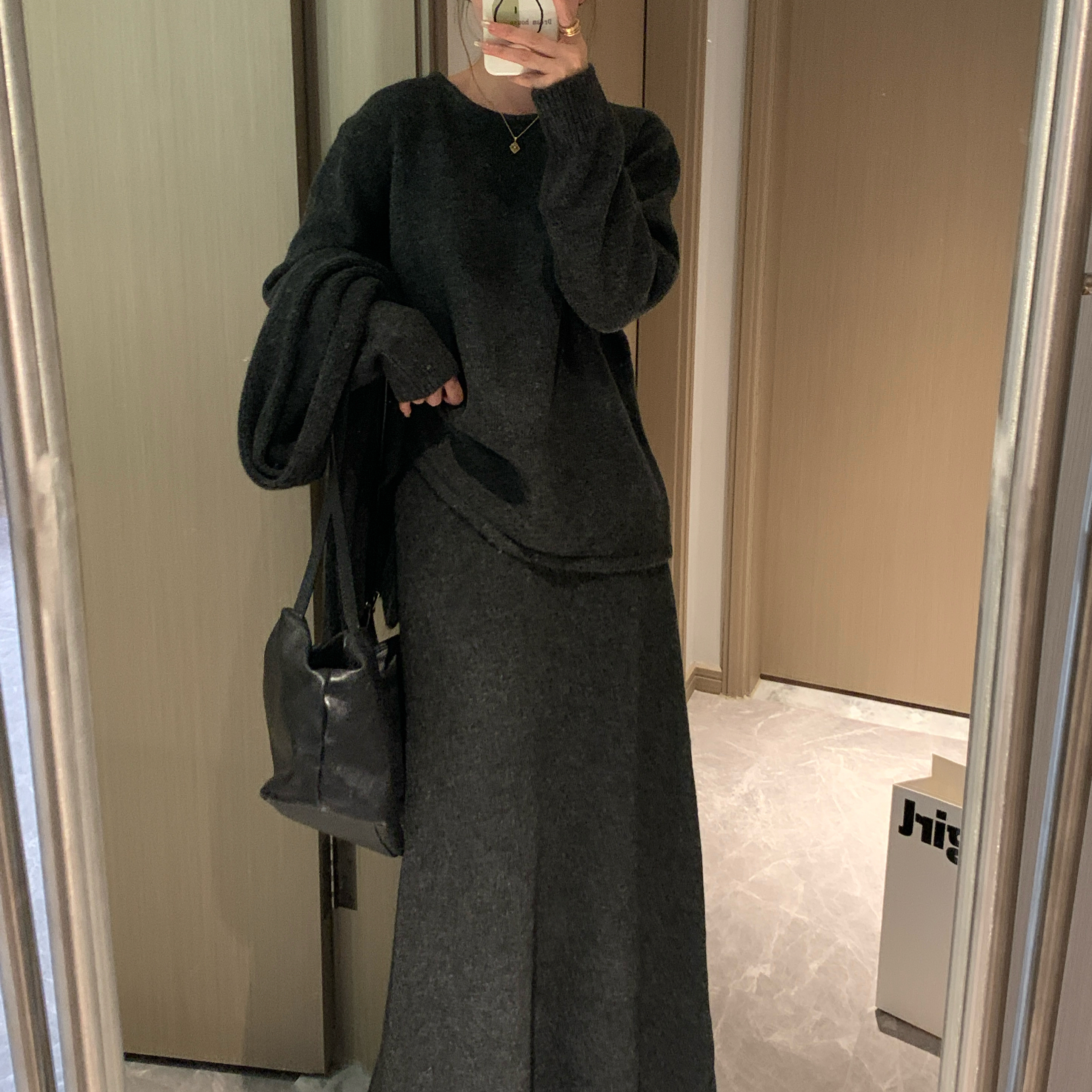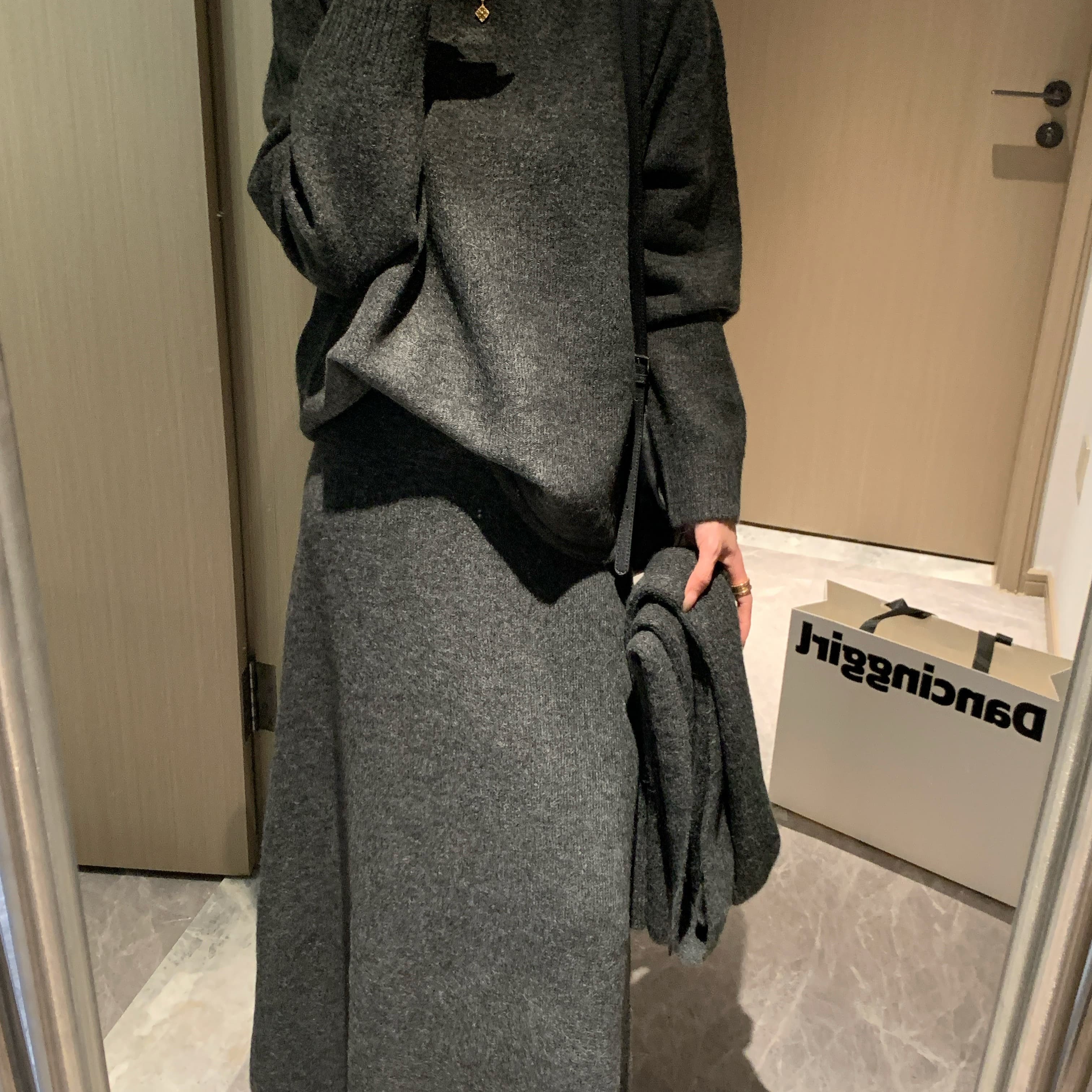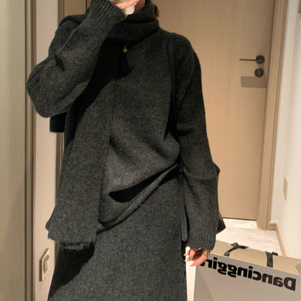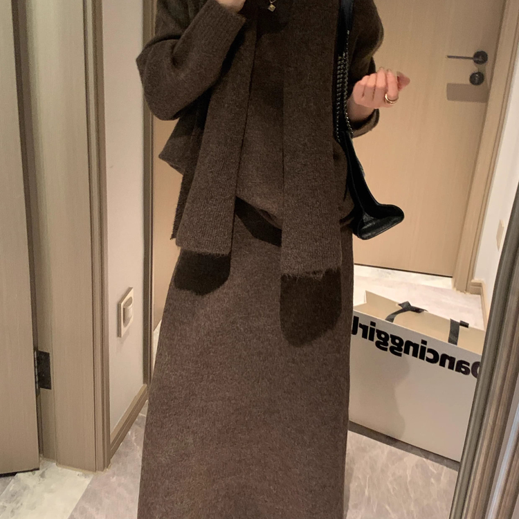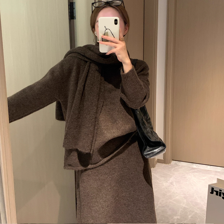 [香蕉派派]慵懒风针织套装女秋冬时尚软糯毛衣半身裙围巾三件套装