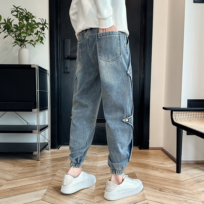 2025秋季新款蓝色牛仔裤男痞帅时尚哈伦裤潮流拼接宽松休闲小脚裤