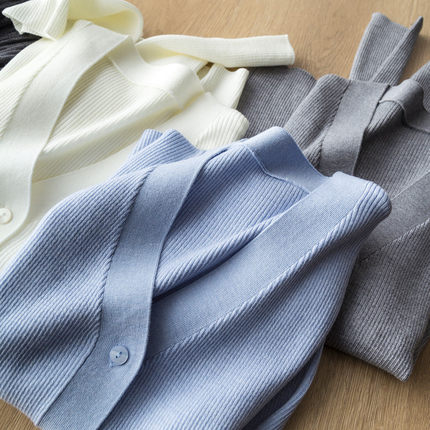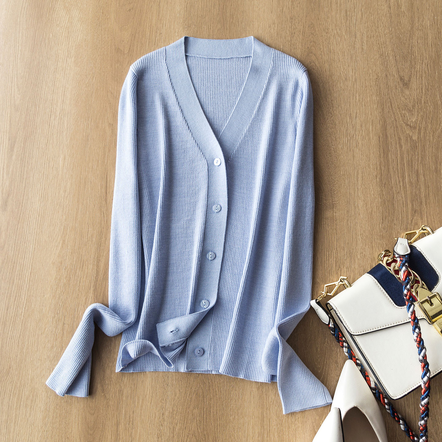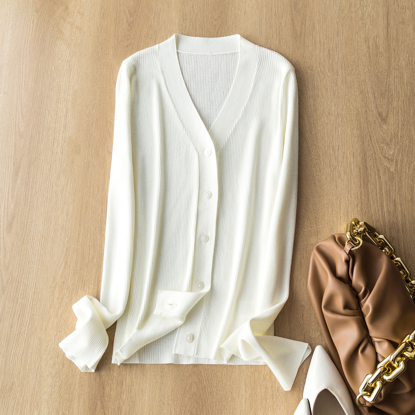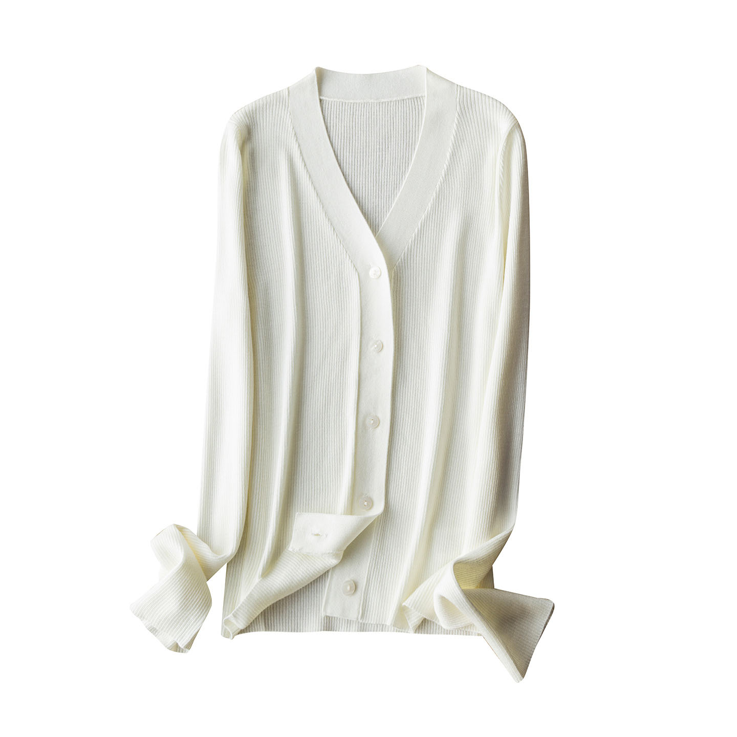 醋酸羊绒羊毛竖坑条肌理感 纯色气质百搭V领针织开衫女