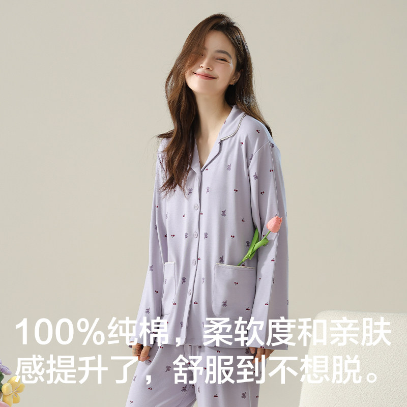 恒源祥睡衣女士纯棉翻领家居服两件套春夏季开衫新款休闲宽松外套
