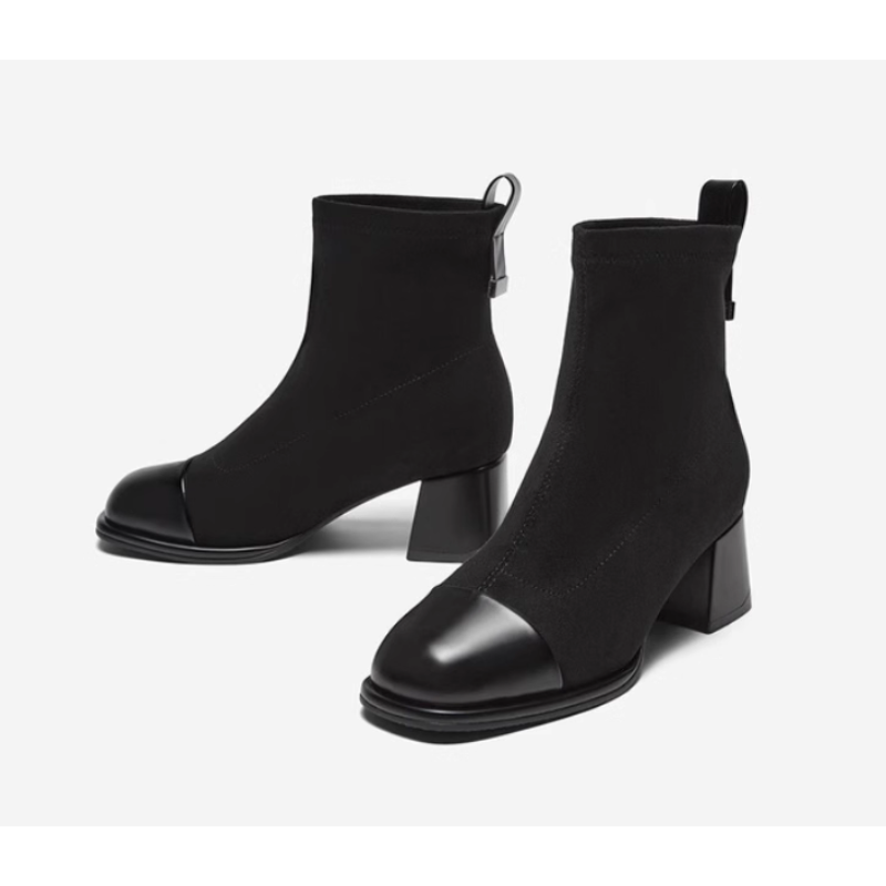 专柜正品百思图2024冬时尚拼接绒面弹力瘦瘦靴粗跟女短靴W7110DD4