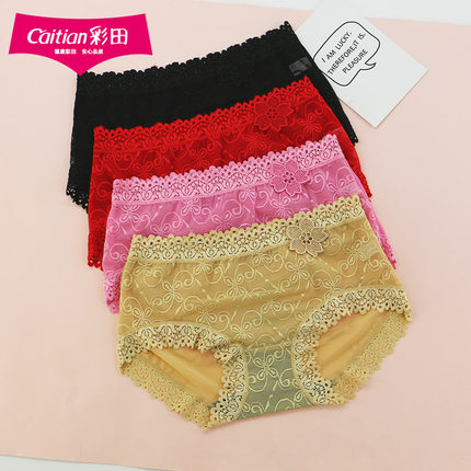 4条价包邮彩田性感透明棉档网纱蕾丝舒适中腰平角内裤女30136时尚