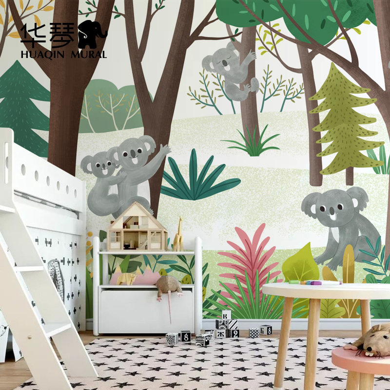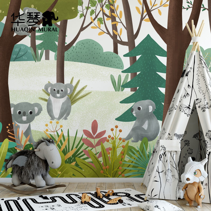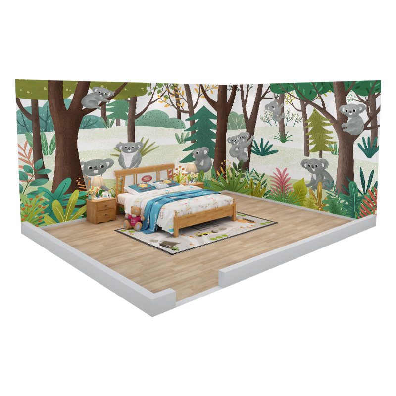 卡通森林考拉男孩女孩儿童房墙纸壁纸环保无缝墙布壁布壁画定制