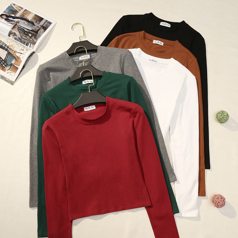 半高领长袖露脐t恤女秋冬紧身漏肚脐打底衫短款高腰纯棉运动上衣