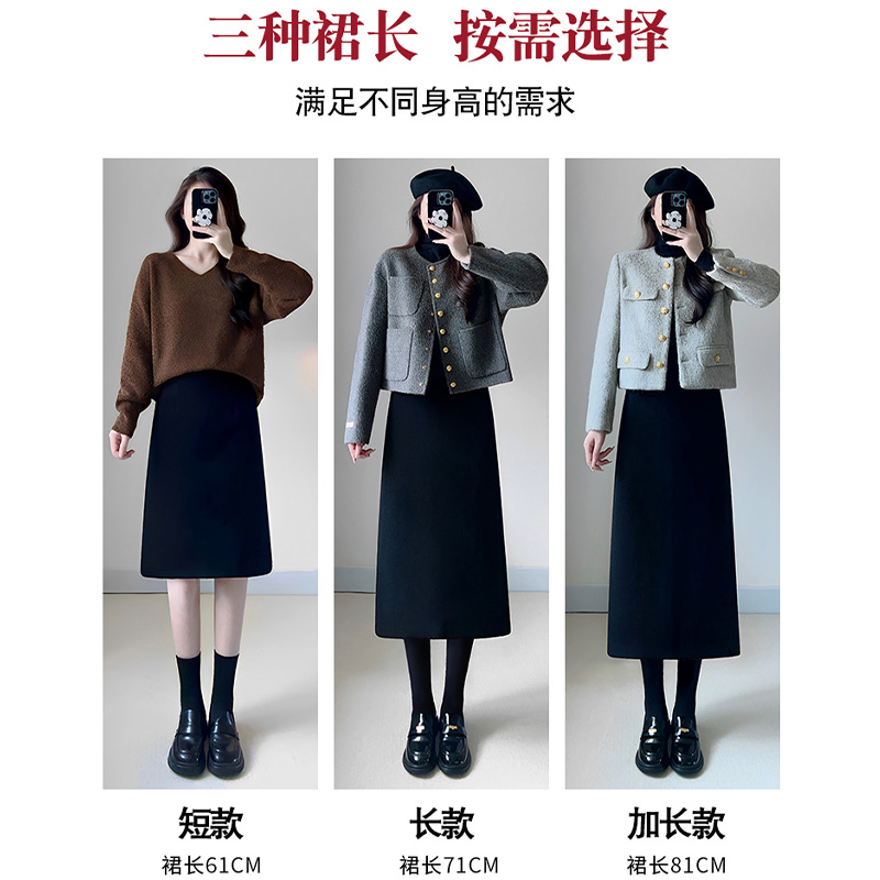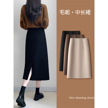 啄木鸟黑色a字半身裙女秋冬今年流行爆款毛呢直筒裙开叉包臀裙