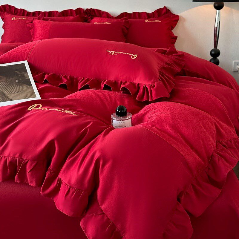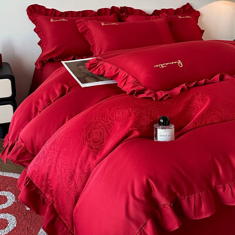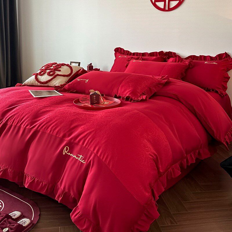 简约陪嫁结婚四件套大红色新婚床单被套婚庆床上用品婚房喜被