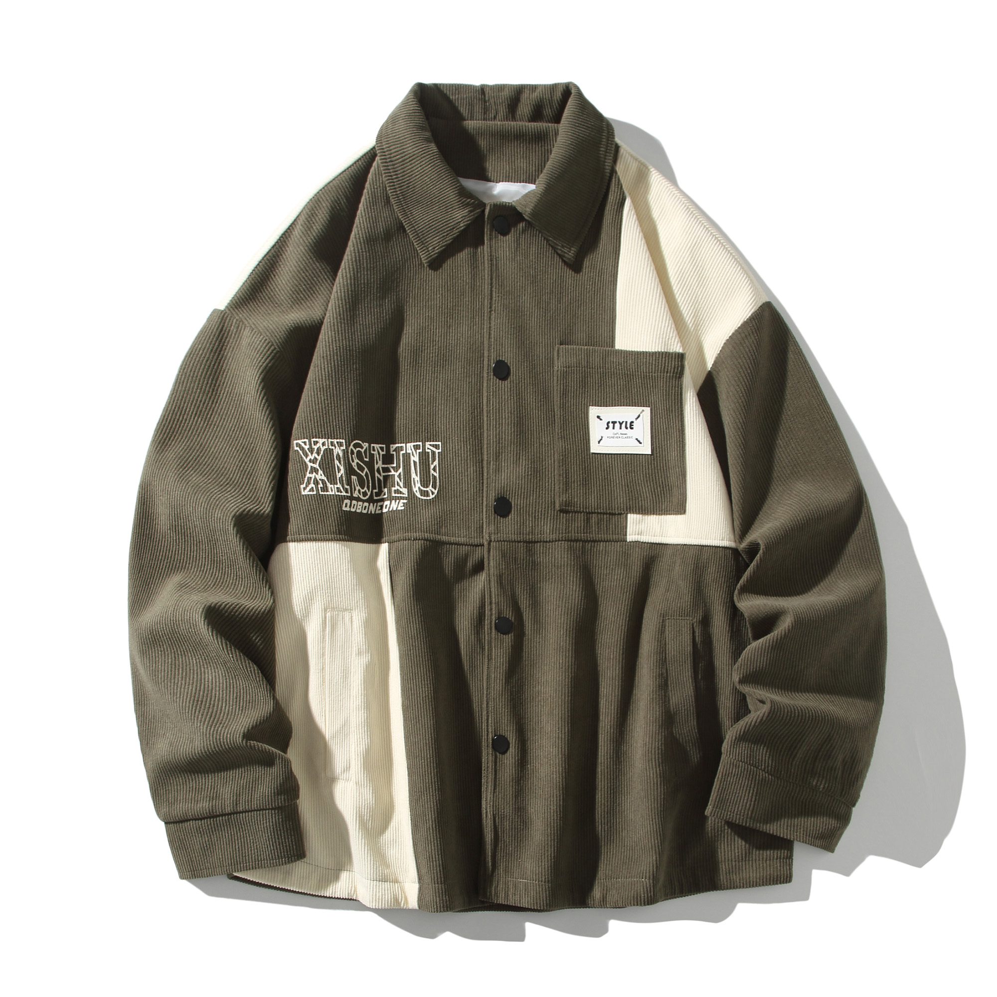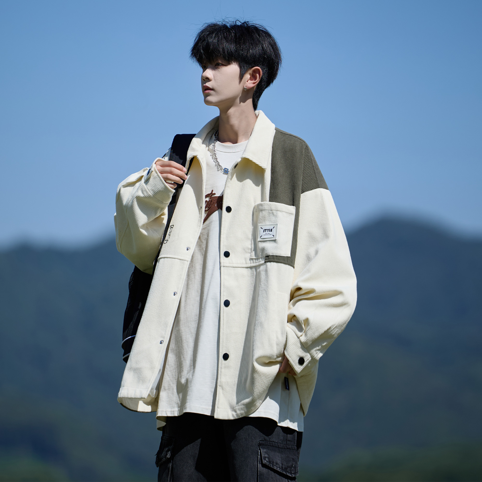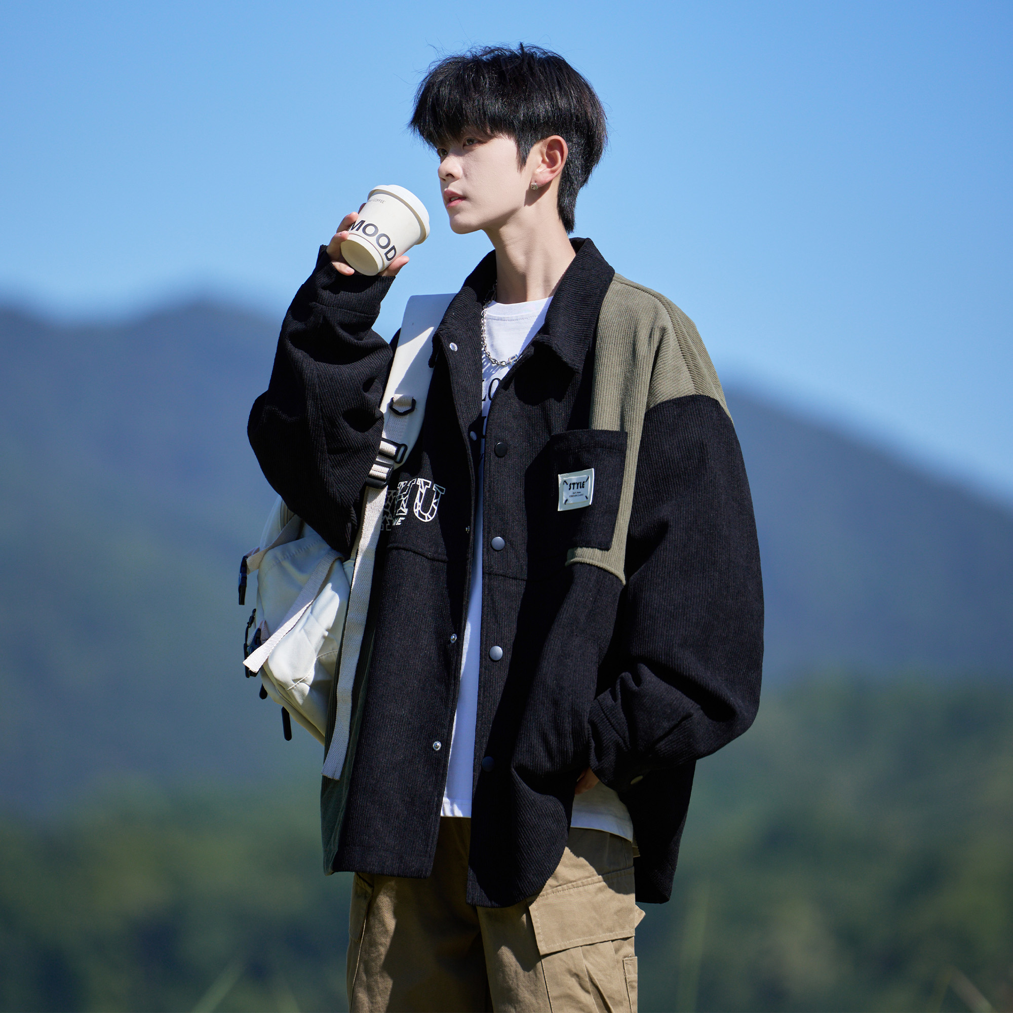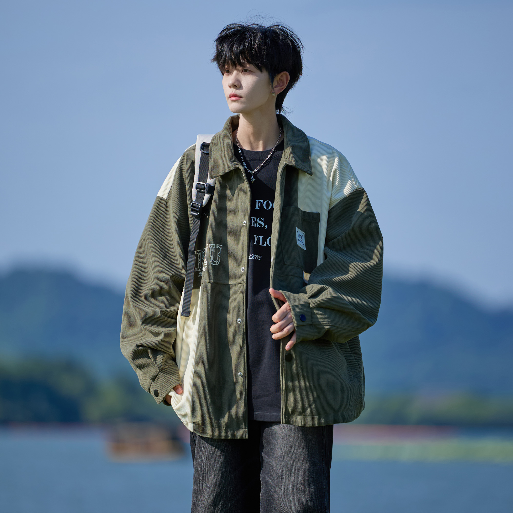 胖胖哥灯芯绒撞色拼接夹克男秋季新款衬衫大码宽松衣服男生厚外套