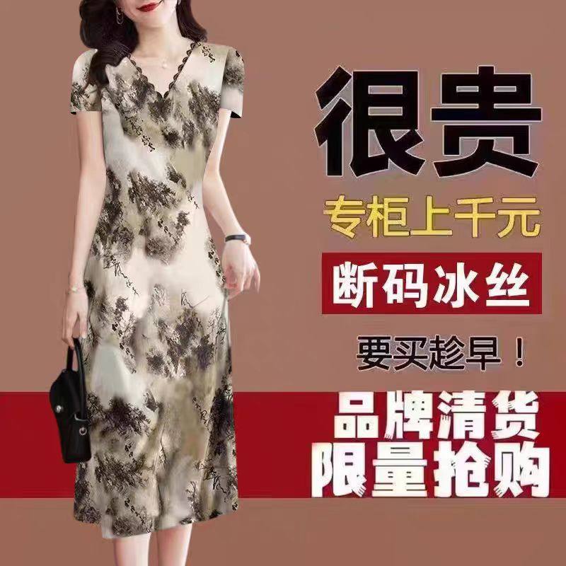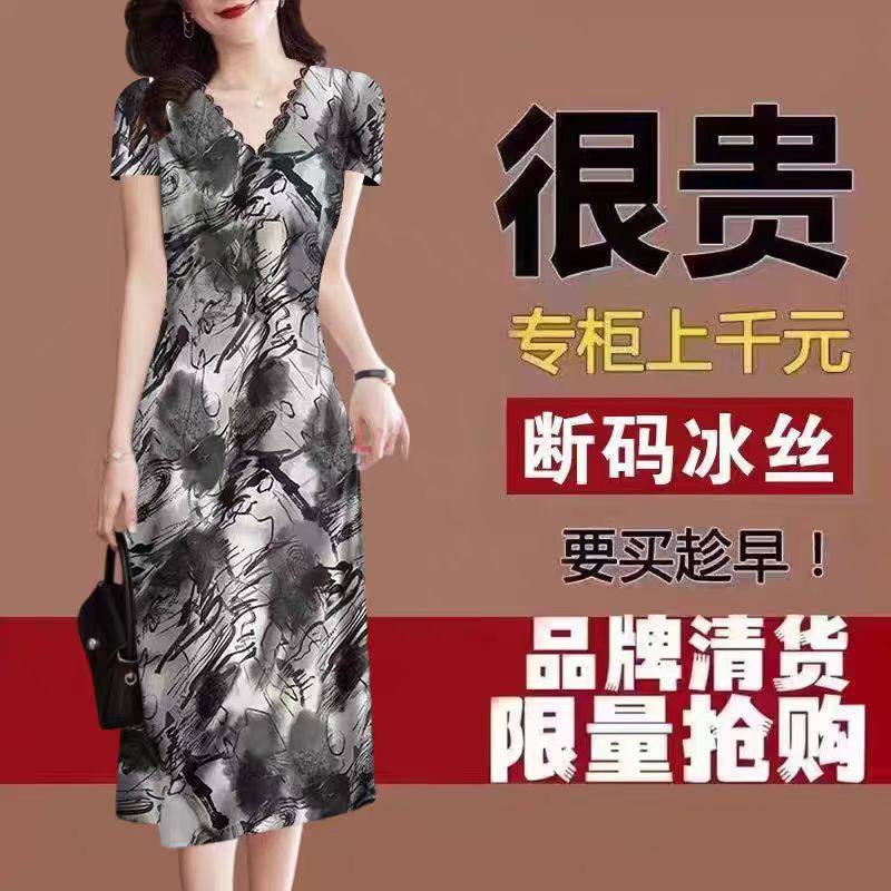 复古中年民族风蕾丝女装夏季新款中长裙洋气印花v领修身连衣裙