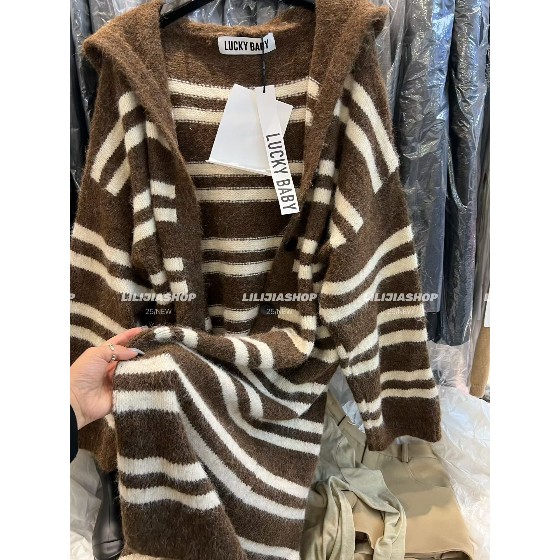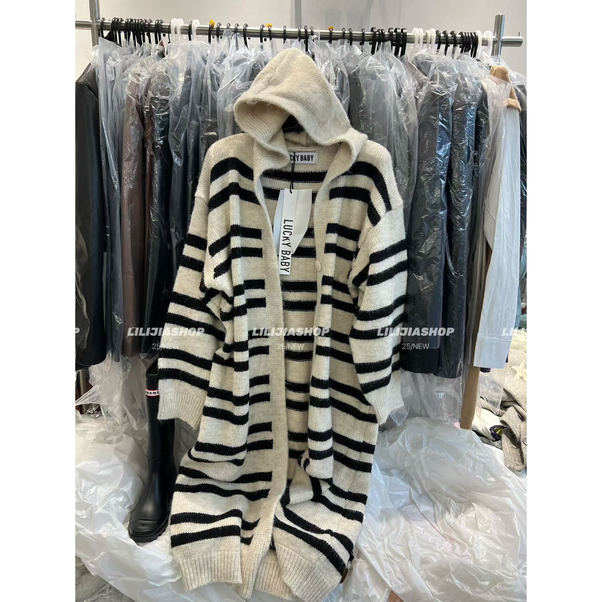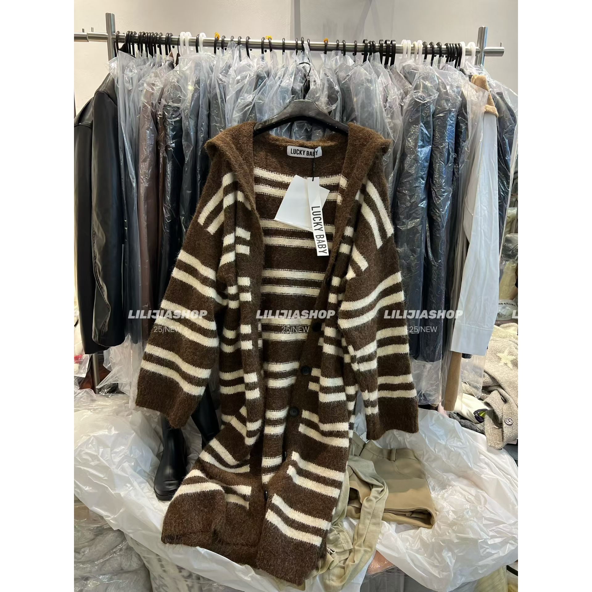 2025秋冬新款韩版时尚百搭宽松显瘦条纹针织开衫毛衣外套女中长款