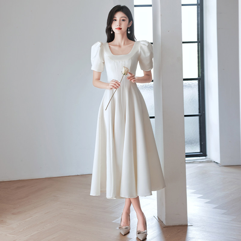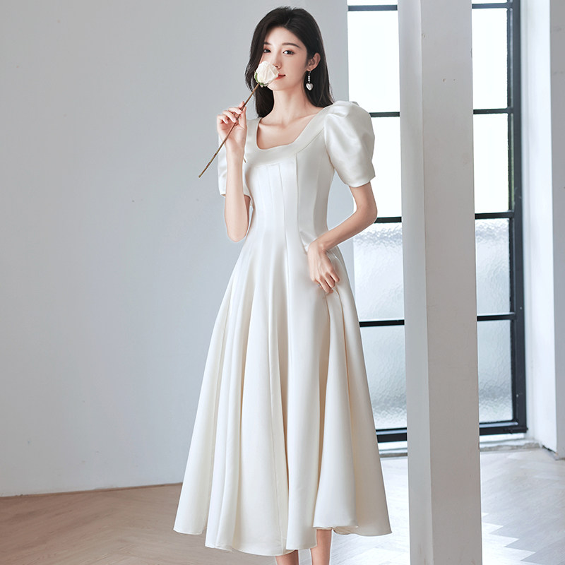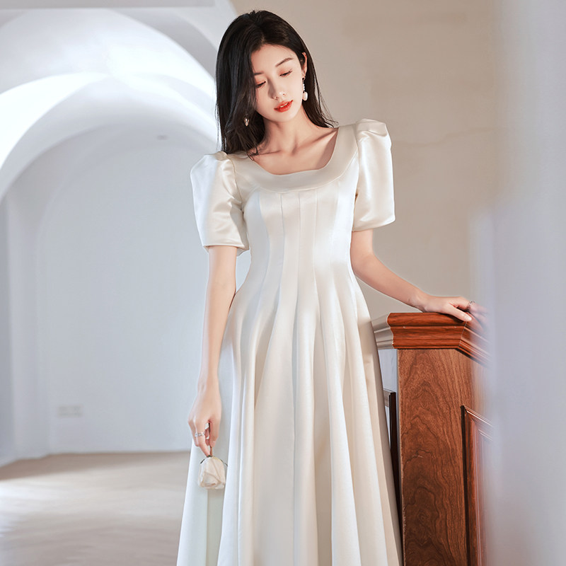 缎面小晚礼服高端轻奢小众主持人高级感白色法式连衣裙方领中长款