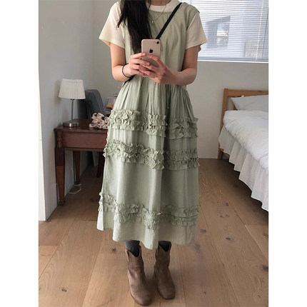良良家温柔复古宽松无袖背心连衣裙女春夏新款褶皱木耳边设计长裙