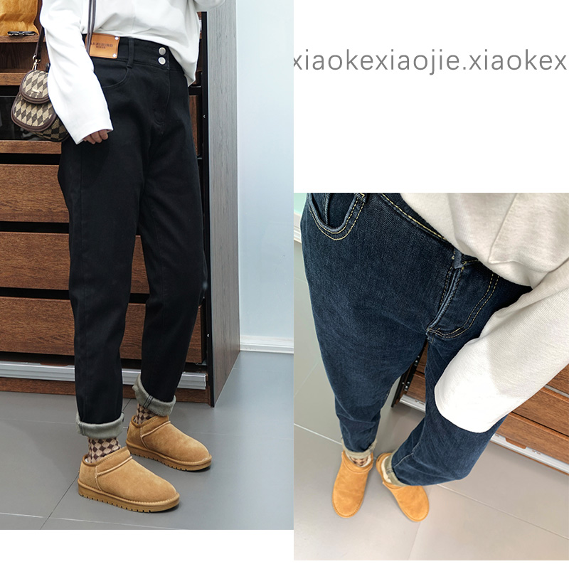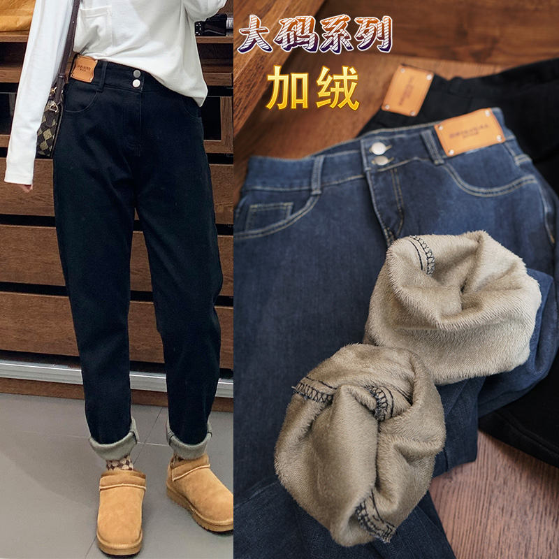 加绒加厚冬大码女高腰哈伦牛仔裤