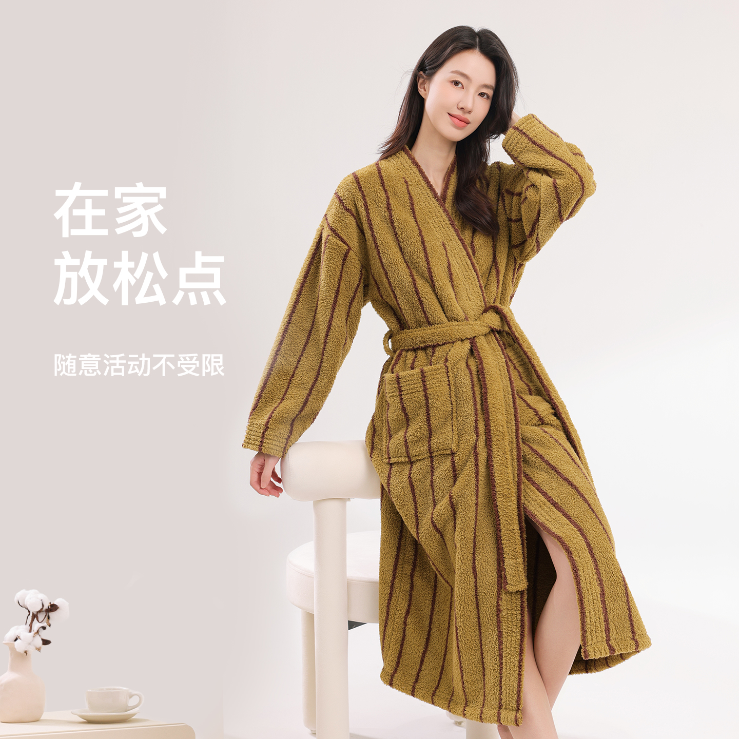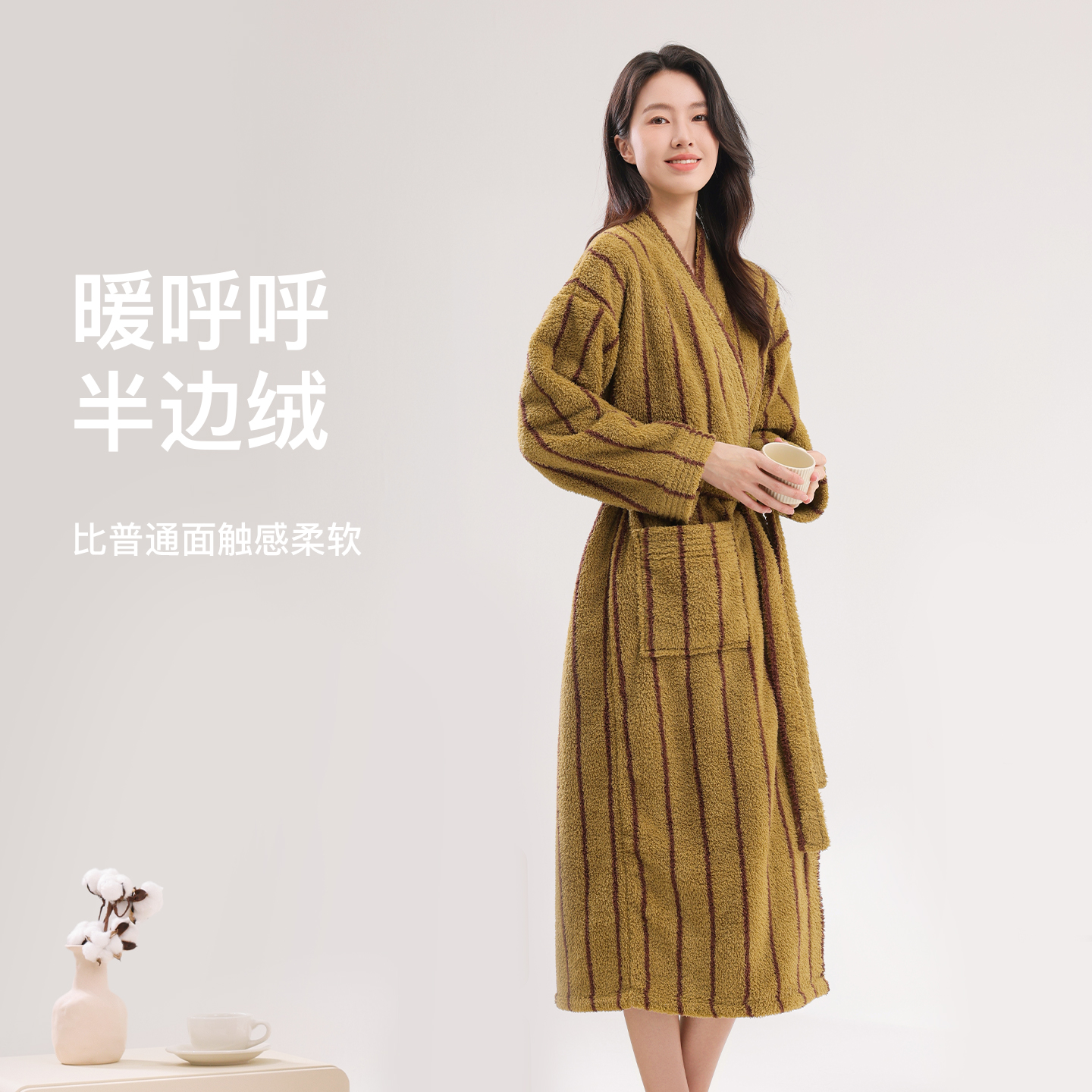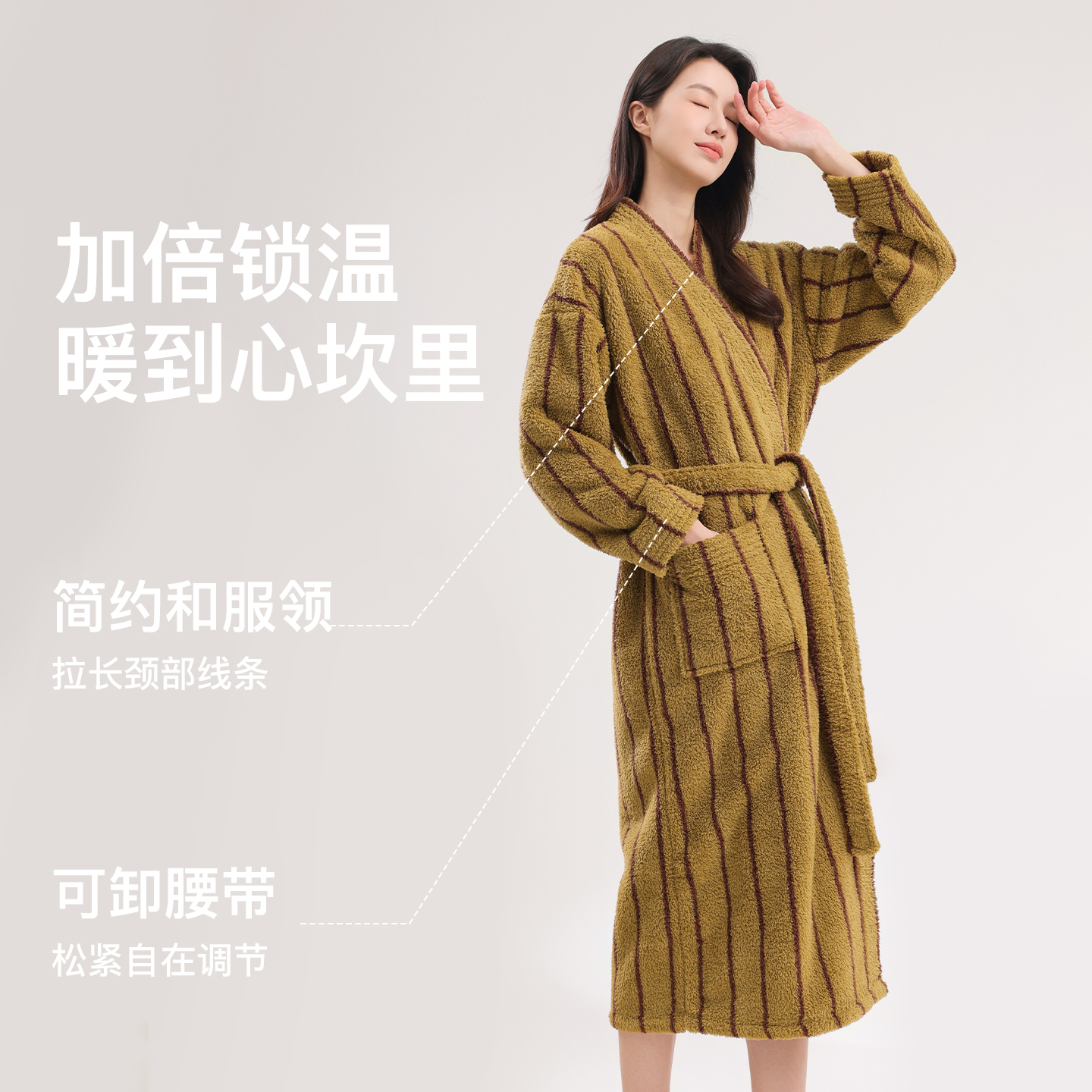睡袍女秋冬季长款加厚加绒条纹珊瑚绒睡衣浴袍男士情侣家居服晨袍