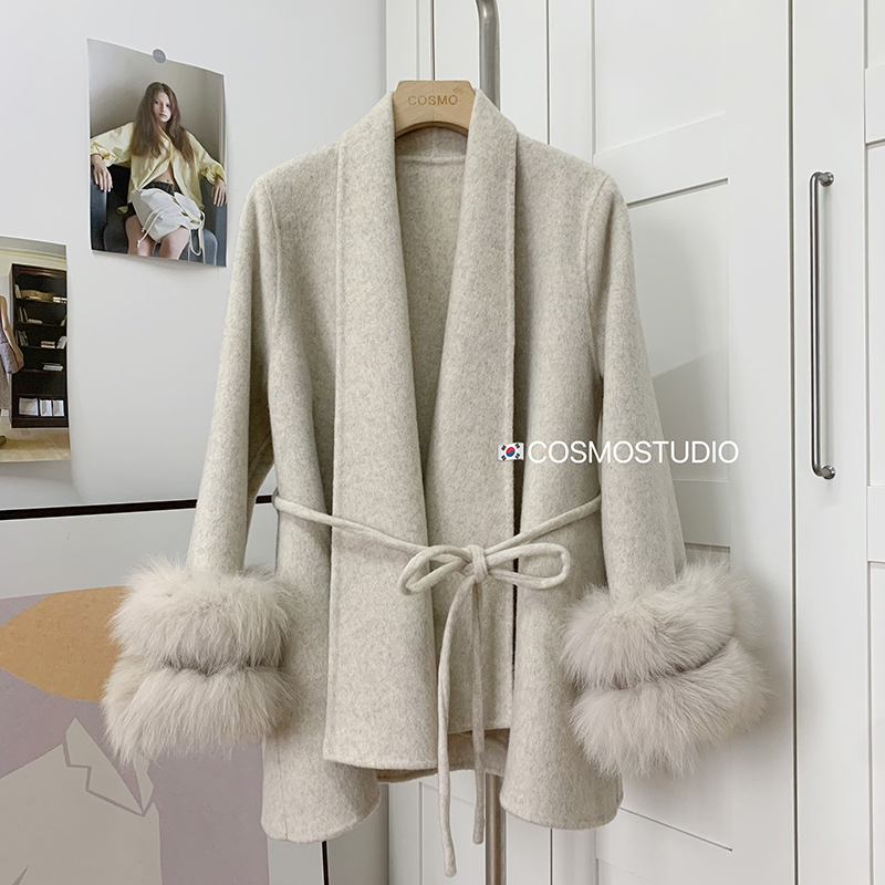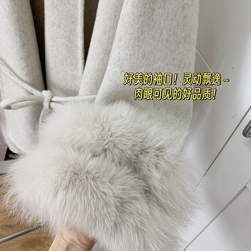 欧洲站大翻领狐狸袖口毛双面羊毛呢子大衣外套短款系带显瘦小个子