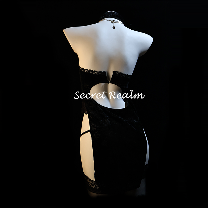 秘境「黑旗绮梦」古典性感旗袍套装镂空御姐风高开叉复古睡裙qqny