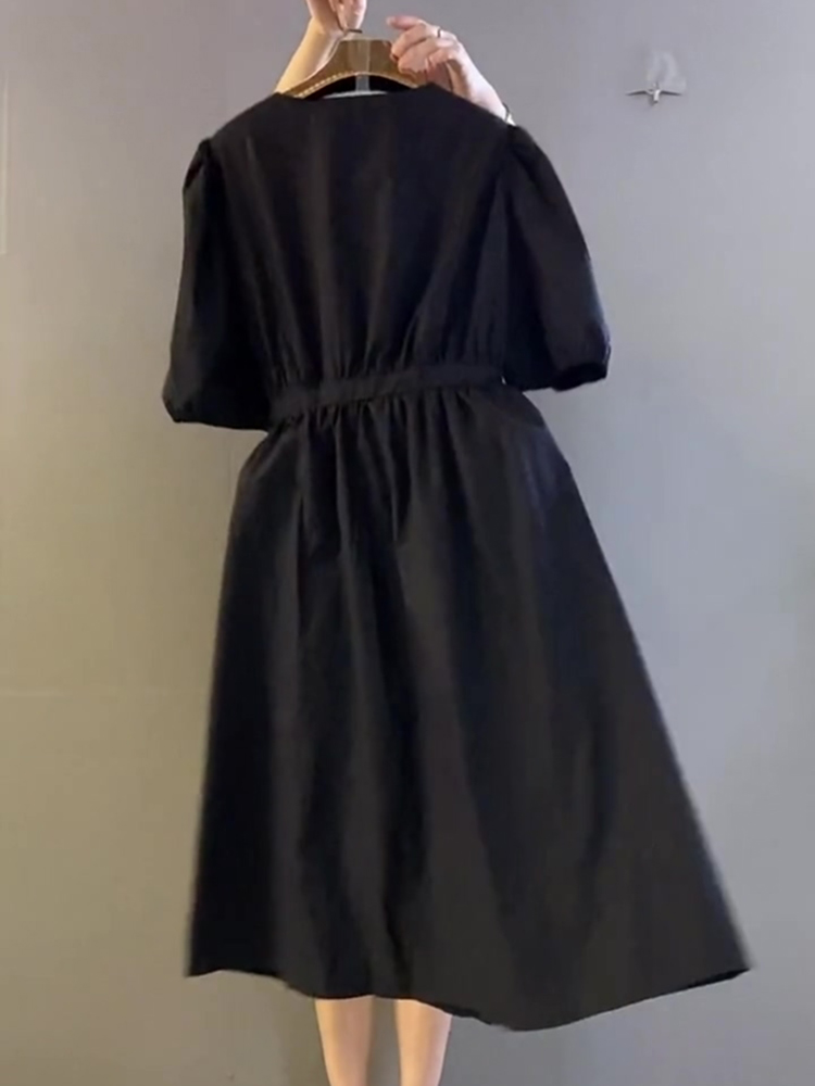 大码女装韩版气质长裙2024夏季新款洋气泡泡袖裙子胖mm系带连衣裙