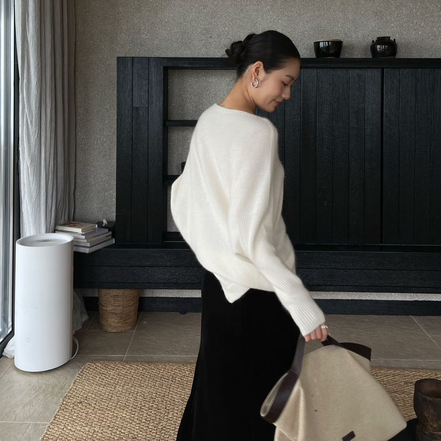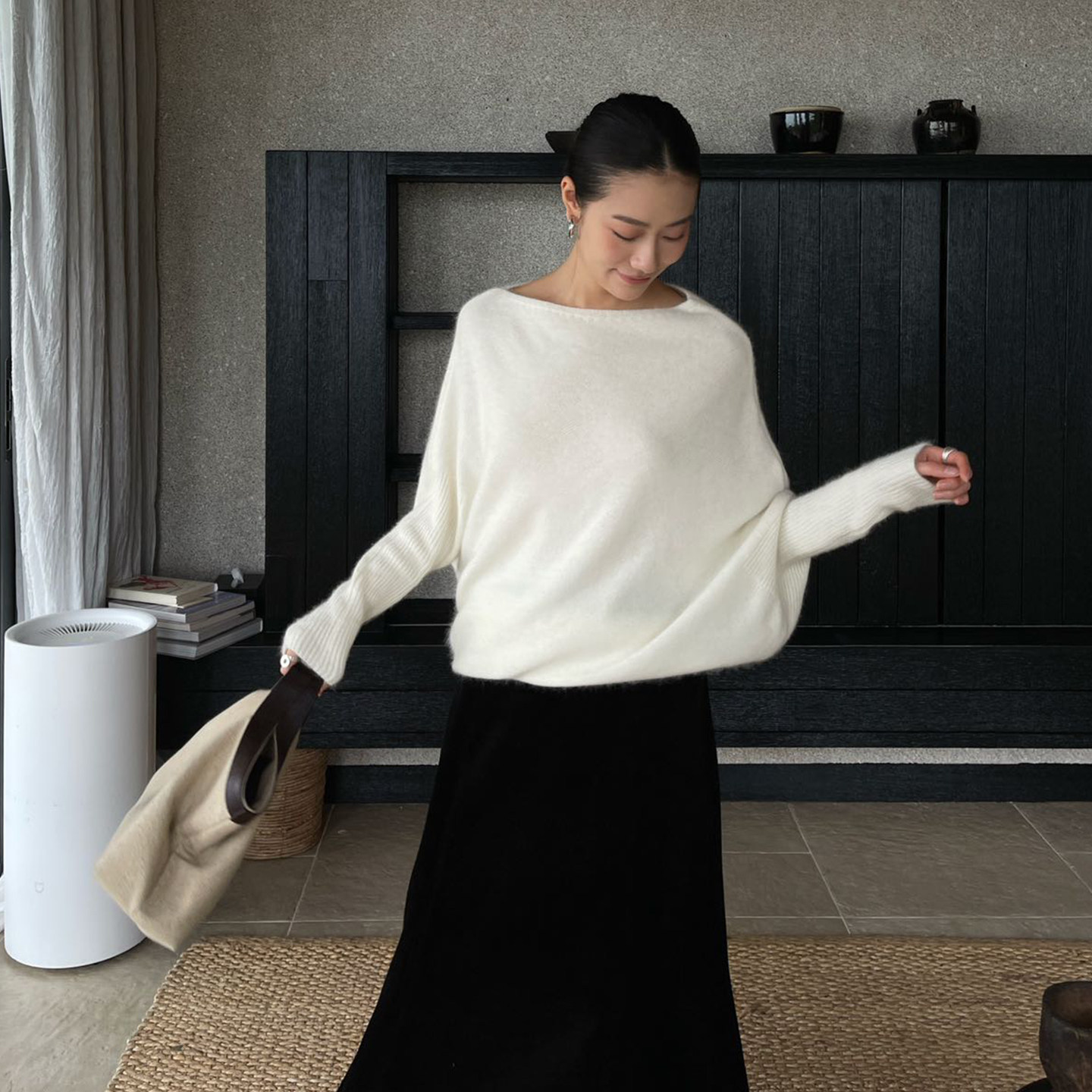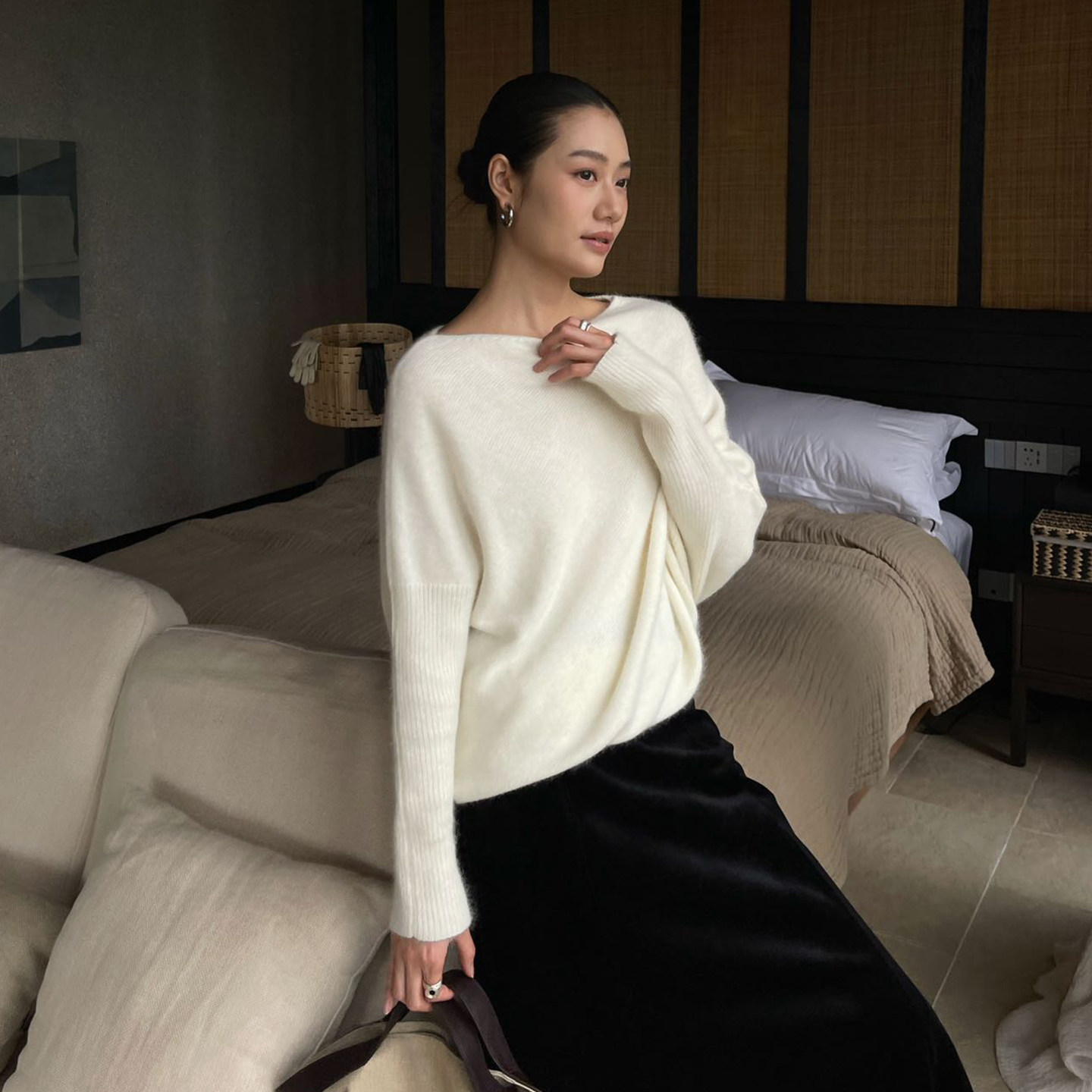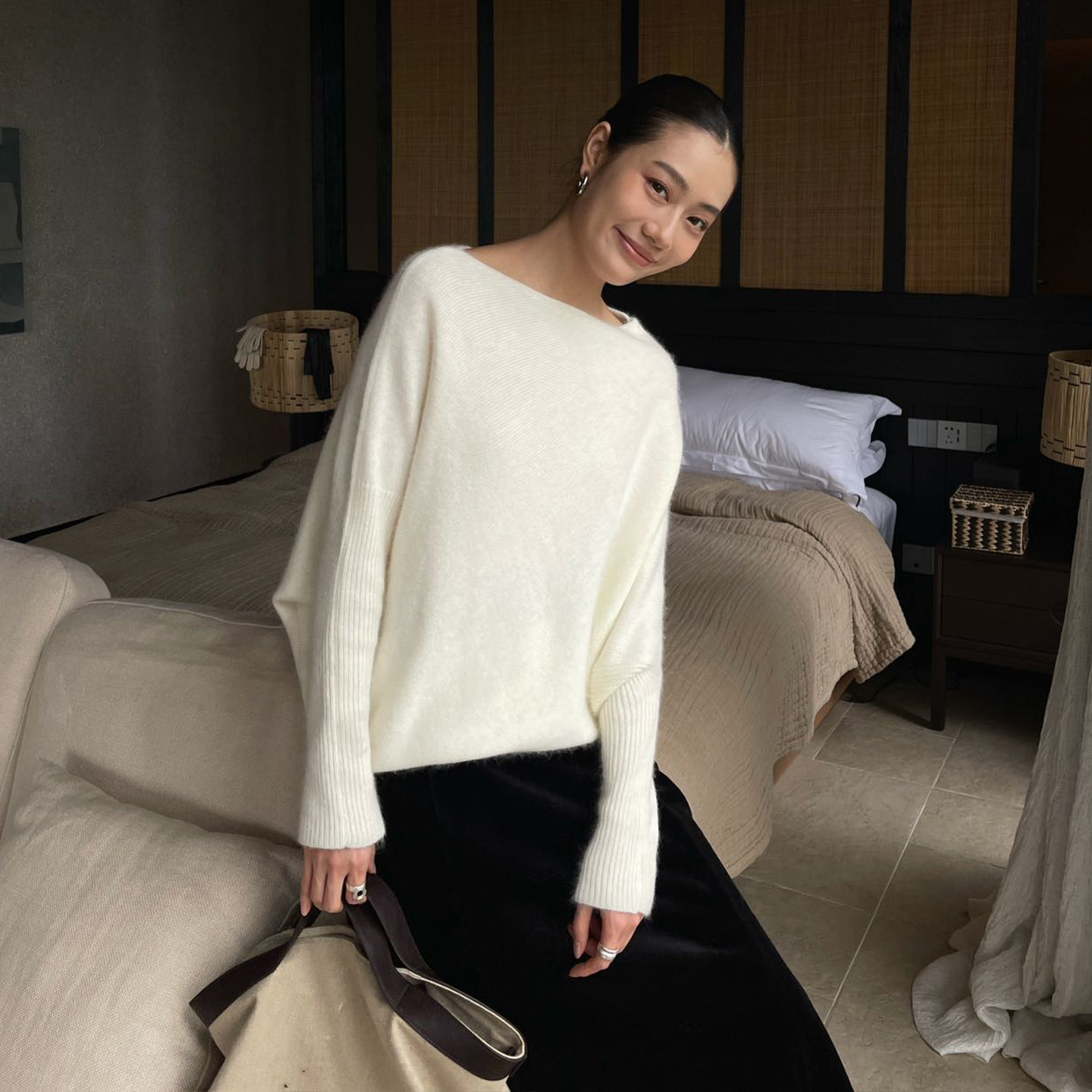 法式不规则纯白色蝙蝠袖宽松百搭羊毛针织衫慵懒风套头毛衣上衣女