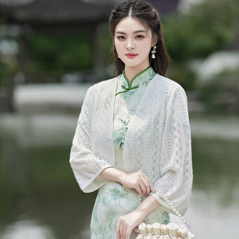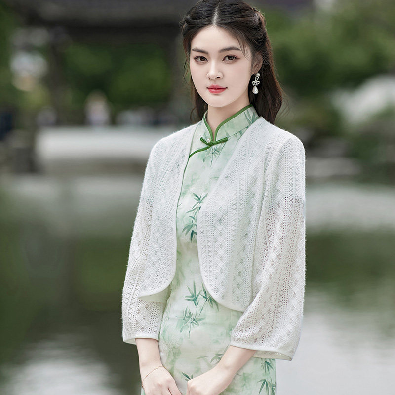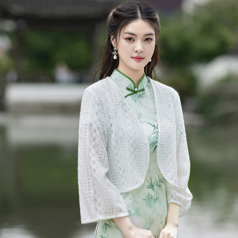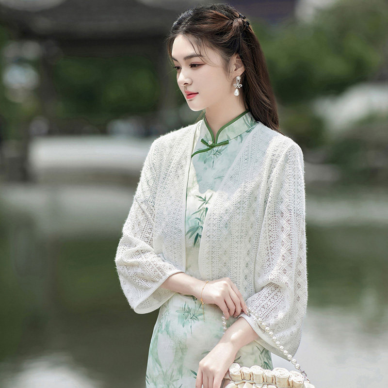 新款国风白色配旗袍披肩女外搭开衫短外套夏季针织空调房斗篷披风