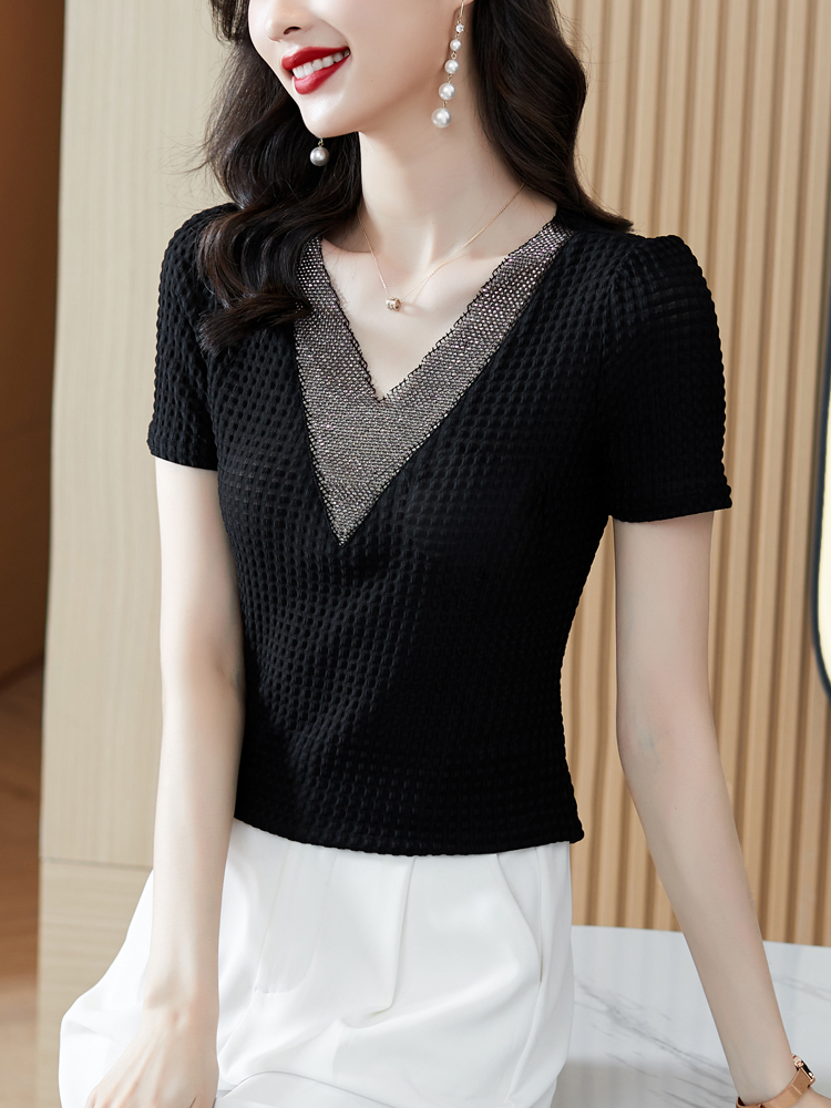 夏季短袖T恤女V领网纱上衣华夫格网眼透气修身显瘦烫钻洋气小衫潮