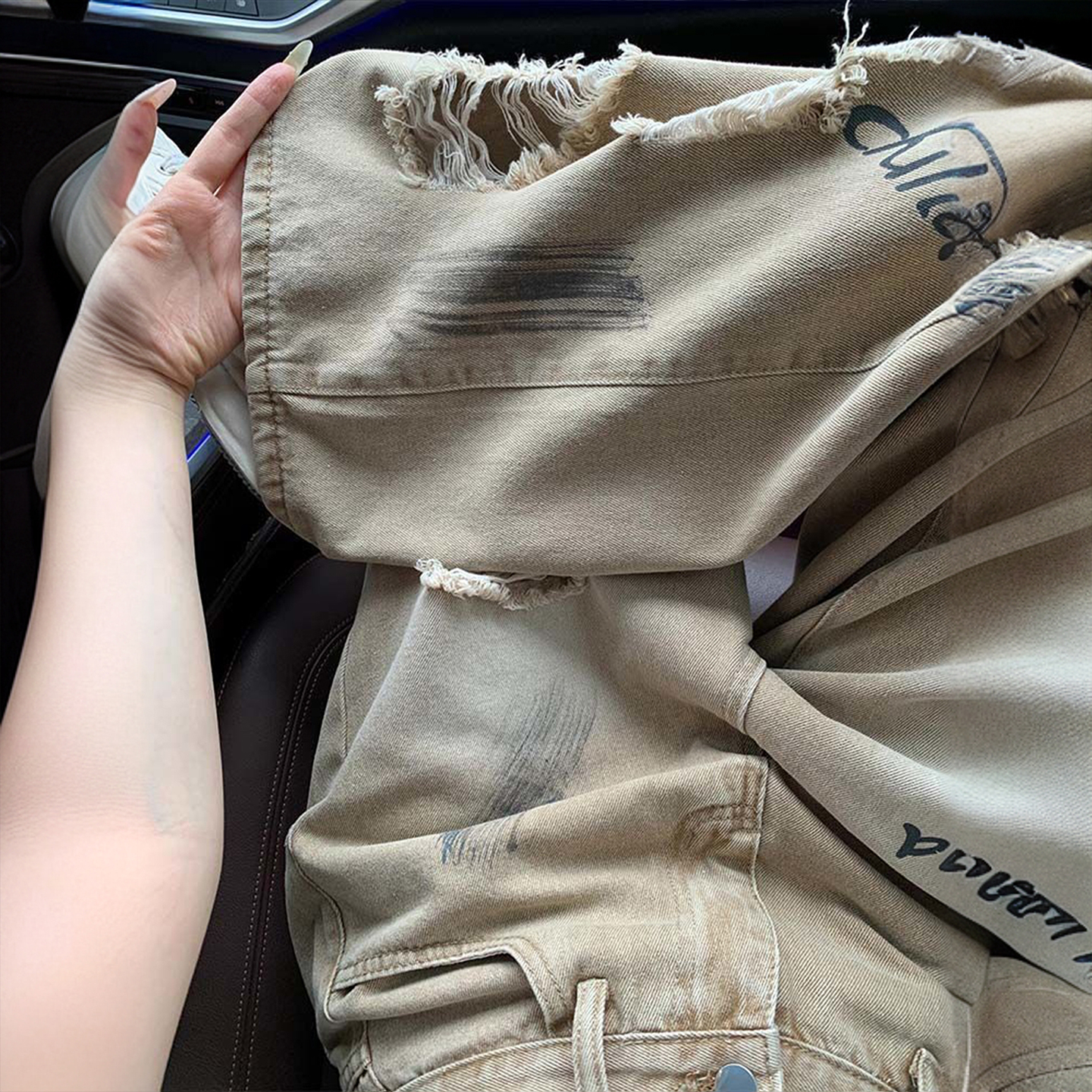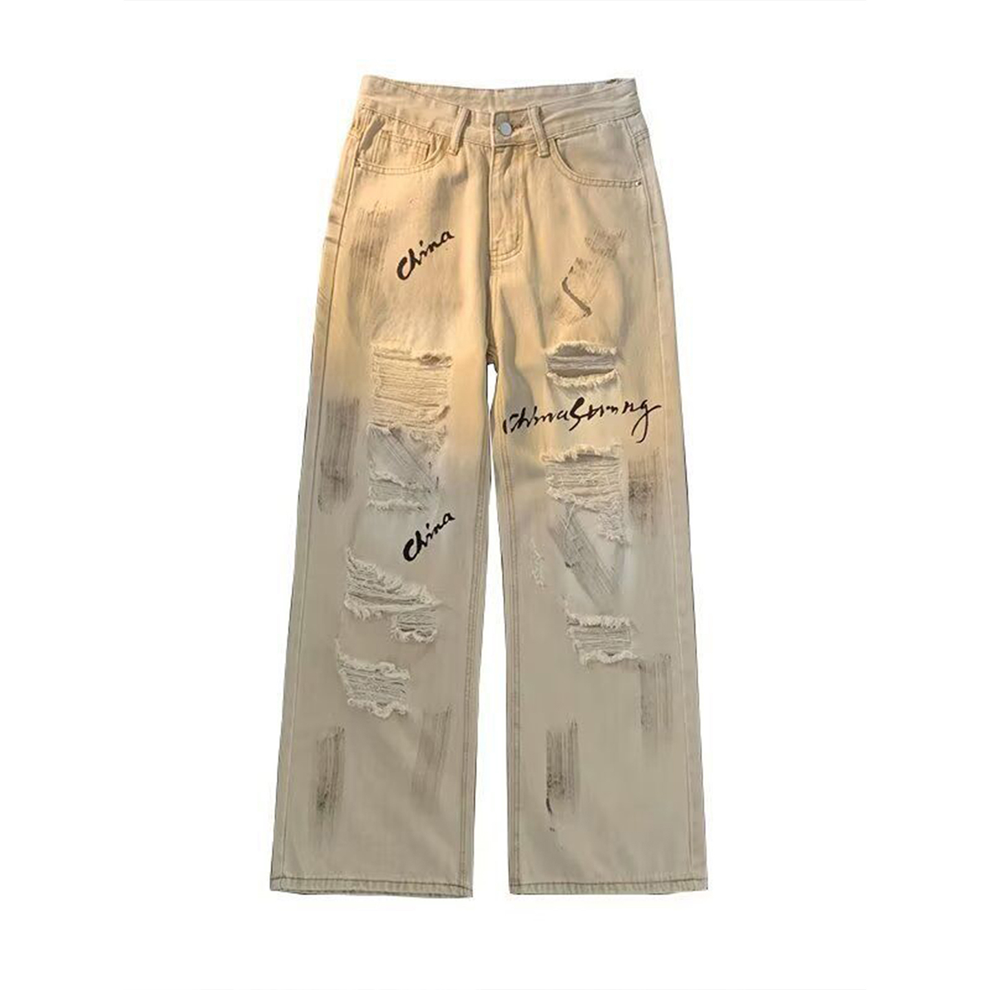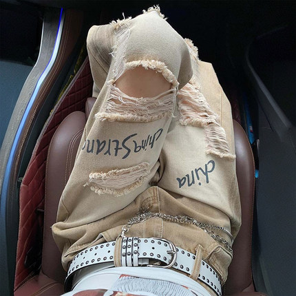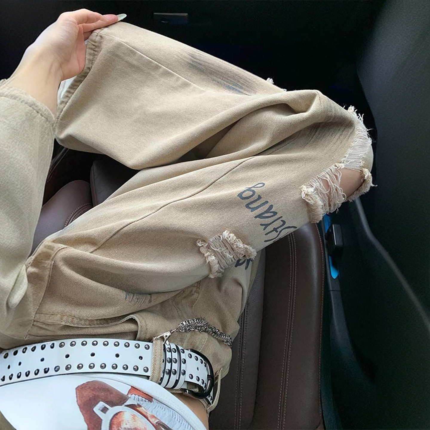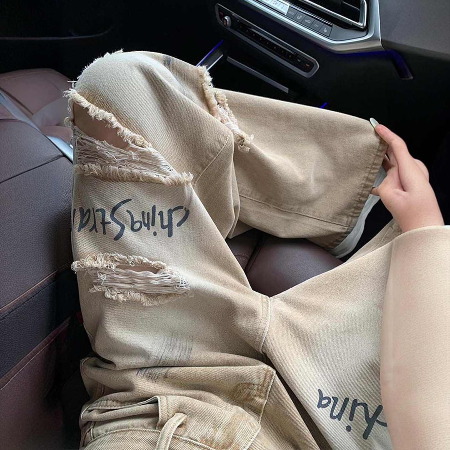 特大码美式高街涂鸦设计小众阔腿牛仔裤女胖mm显瘦遮肉破洞长裤子