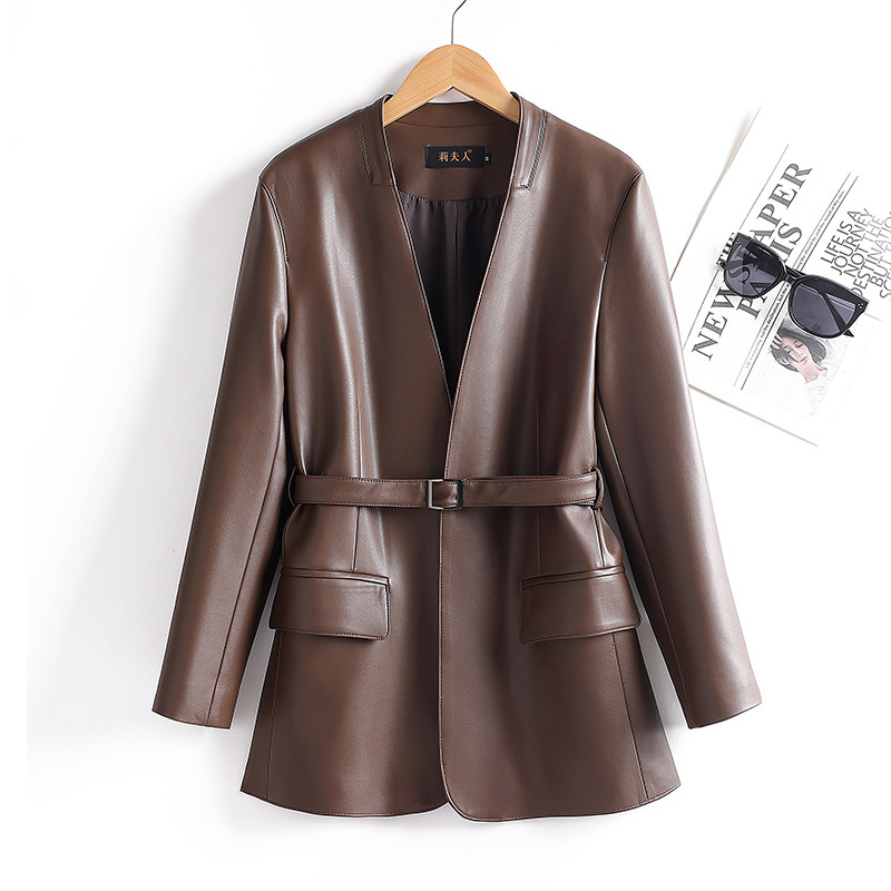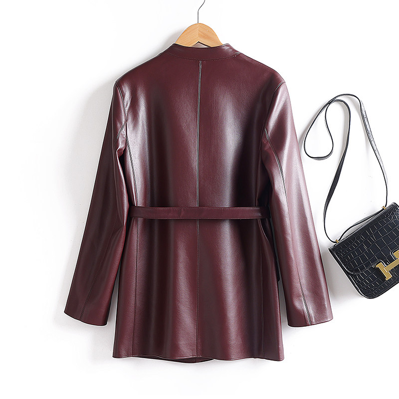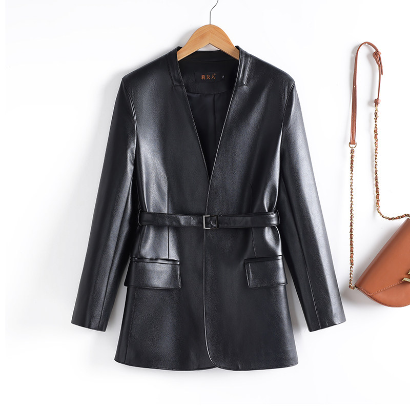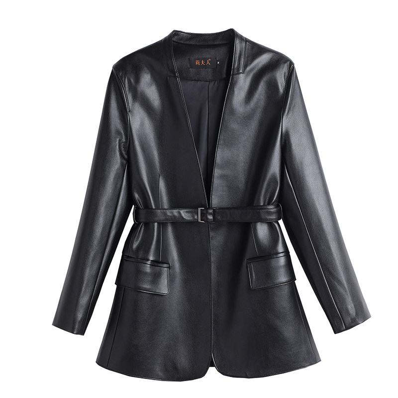 2025春秋新款真皮皮衣女中长款小西服系带收腰风衣绵羊皮夹克外套