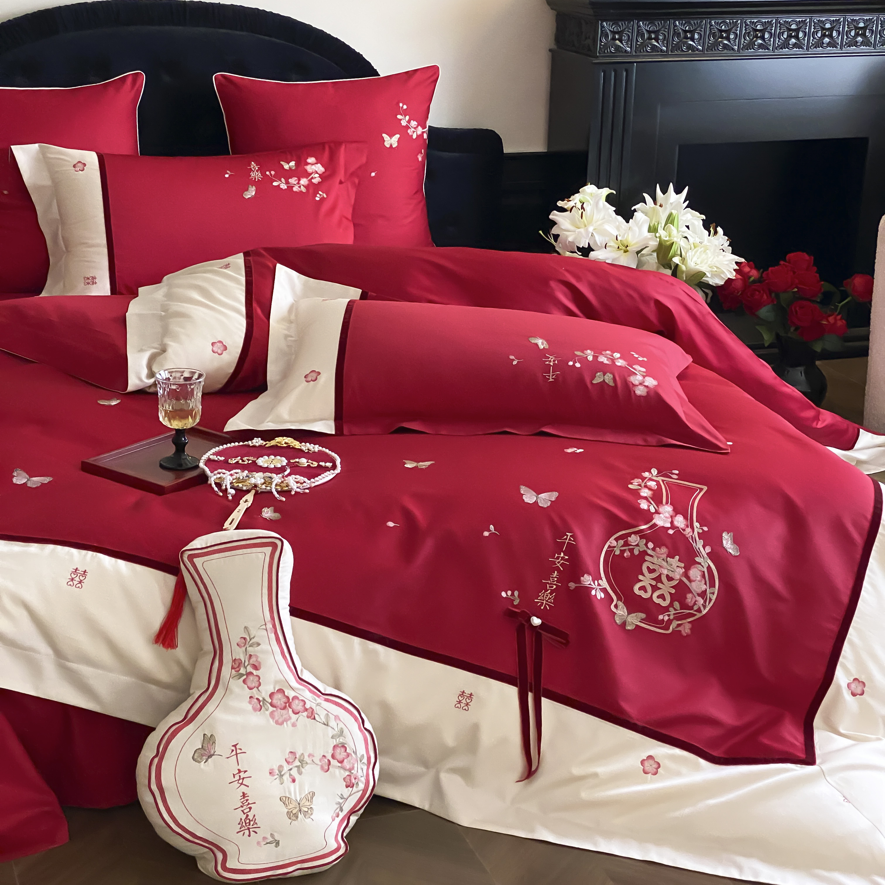 新中式婚庆100s长绒棉全棉四件套纯棉床单被套高档床上用品大红色