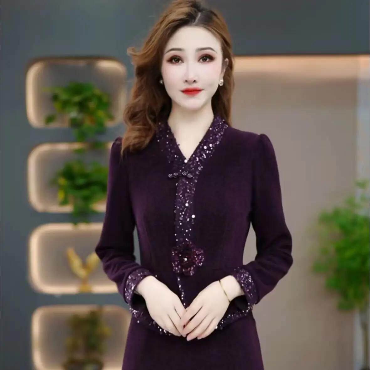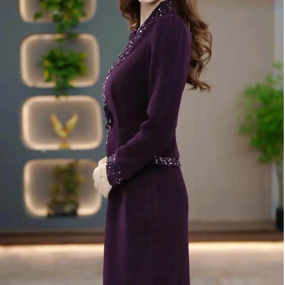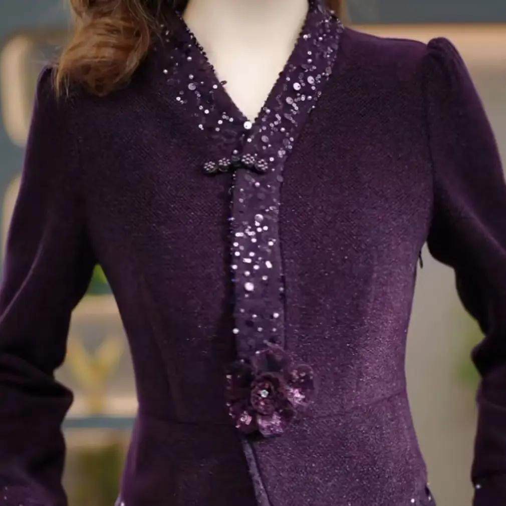 高端精致V领亮片连衣裙女紫色长袖气质轻奢礼服裙