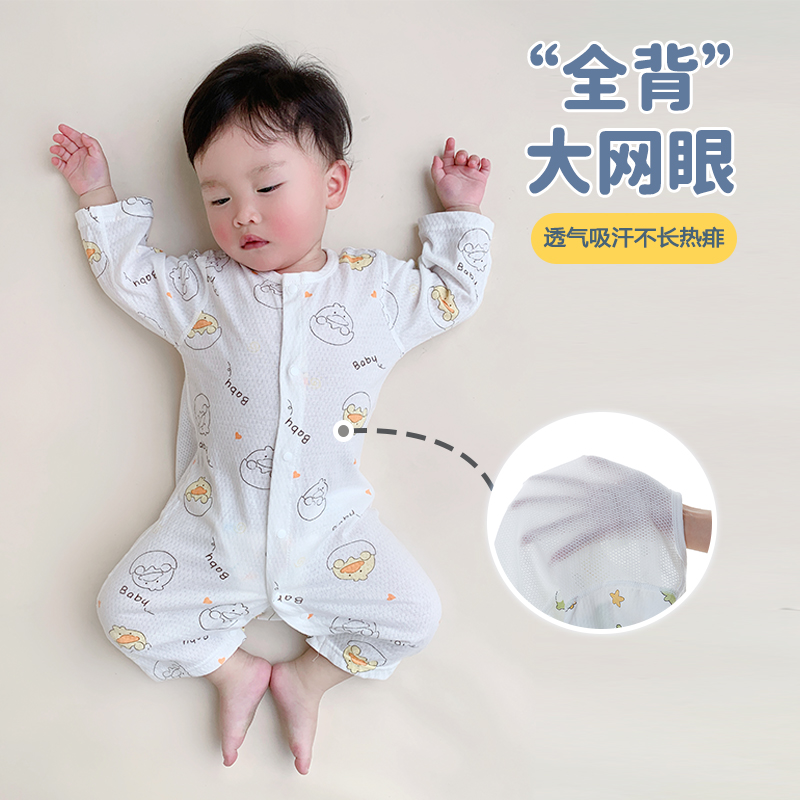 春夏薄款长袖长裤婴儿连体衣男女宝宝空调服睡衣纯棉哈衣透气网眼