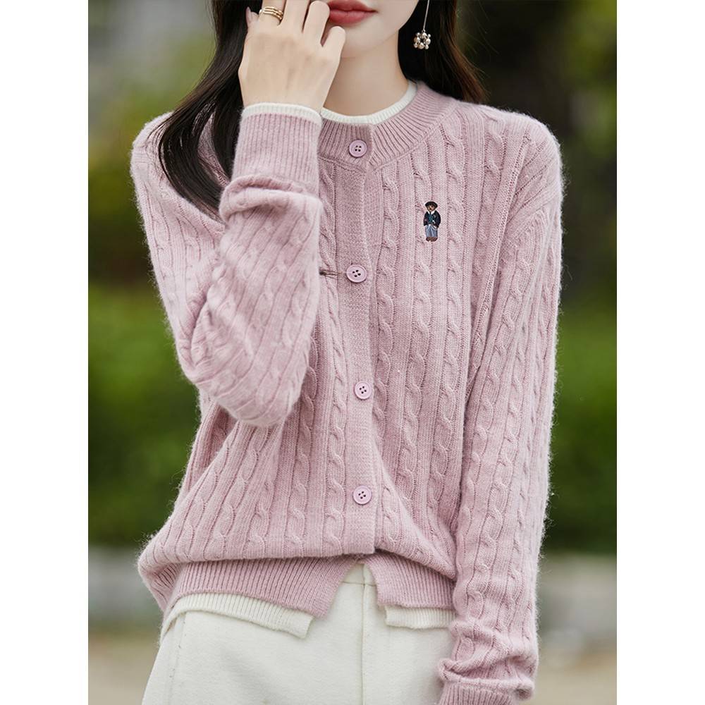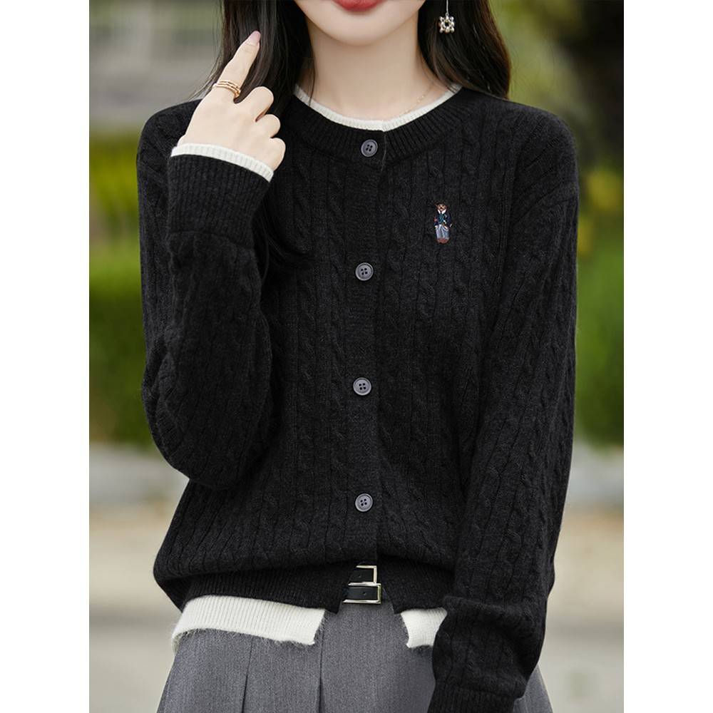 假两件刺绣小熊螺纹针织开衫外套女2025新款春秋大码女装秋冬毛衣