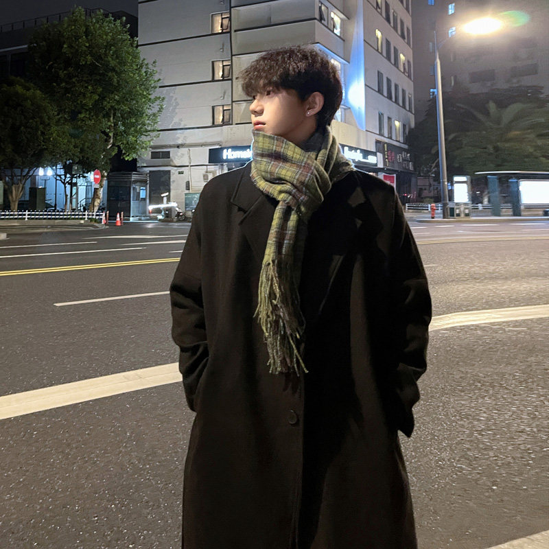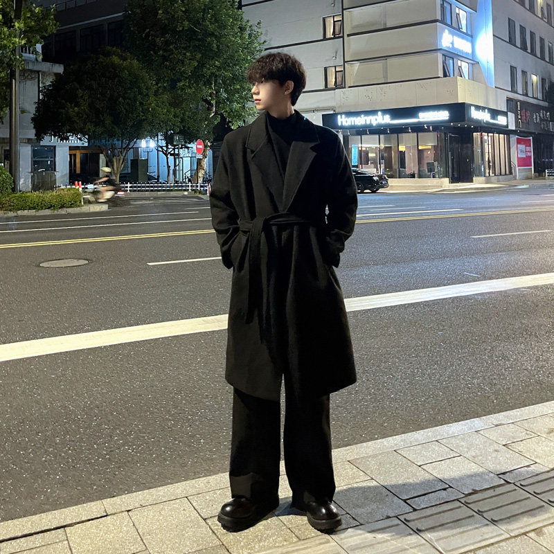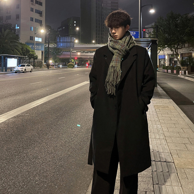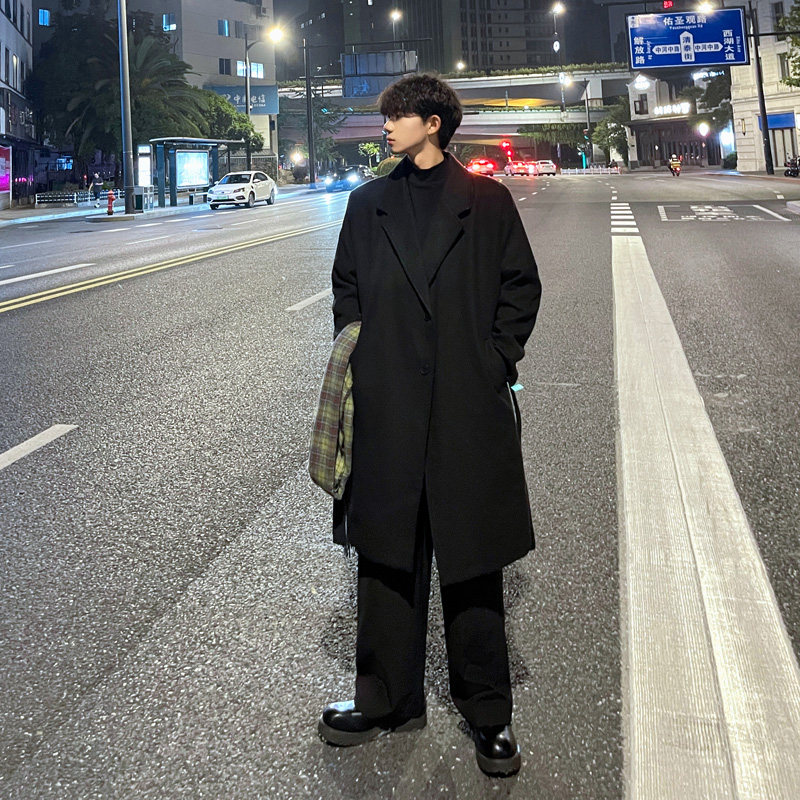 韩版英伦风尼大衣高级感男秋冬中长款过膝西装外套三件套毛呢风衣