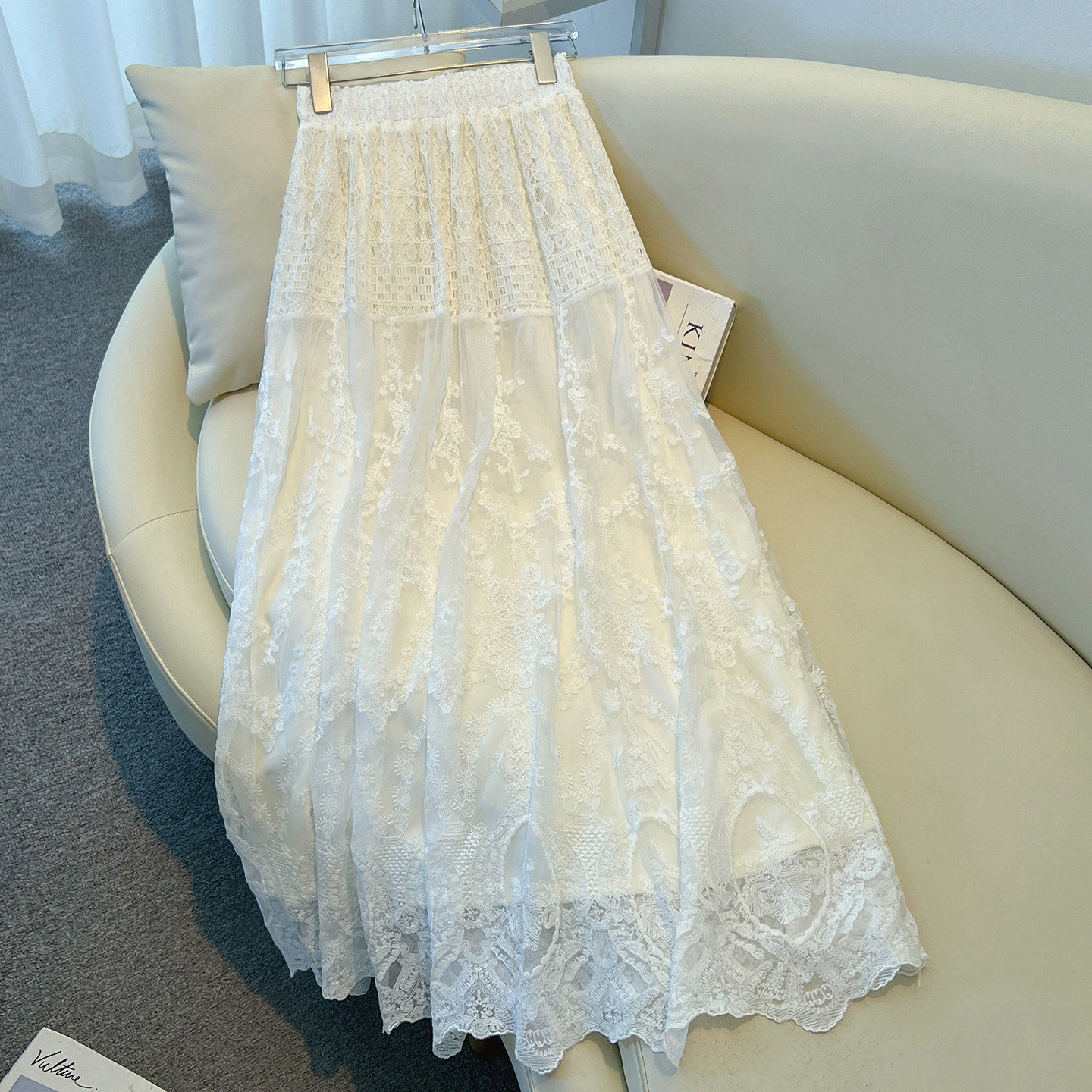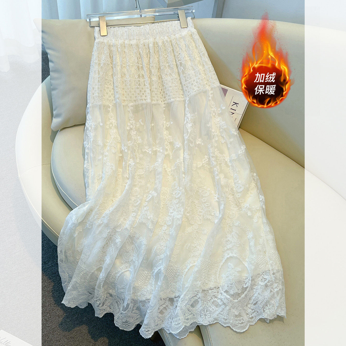 加绒白色蕾丝半身裙女2026春季新款设计感a字裙气质网纱中长裙子
