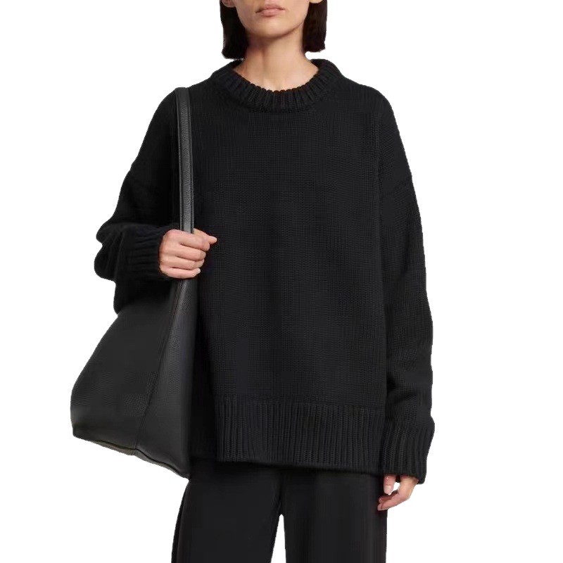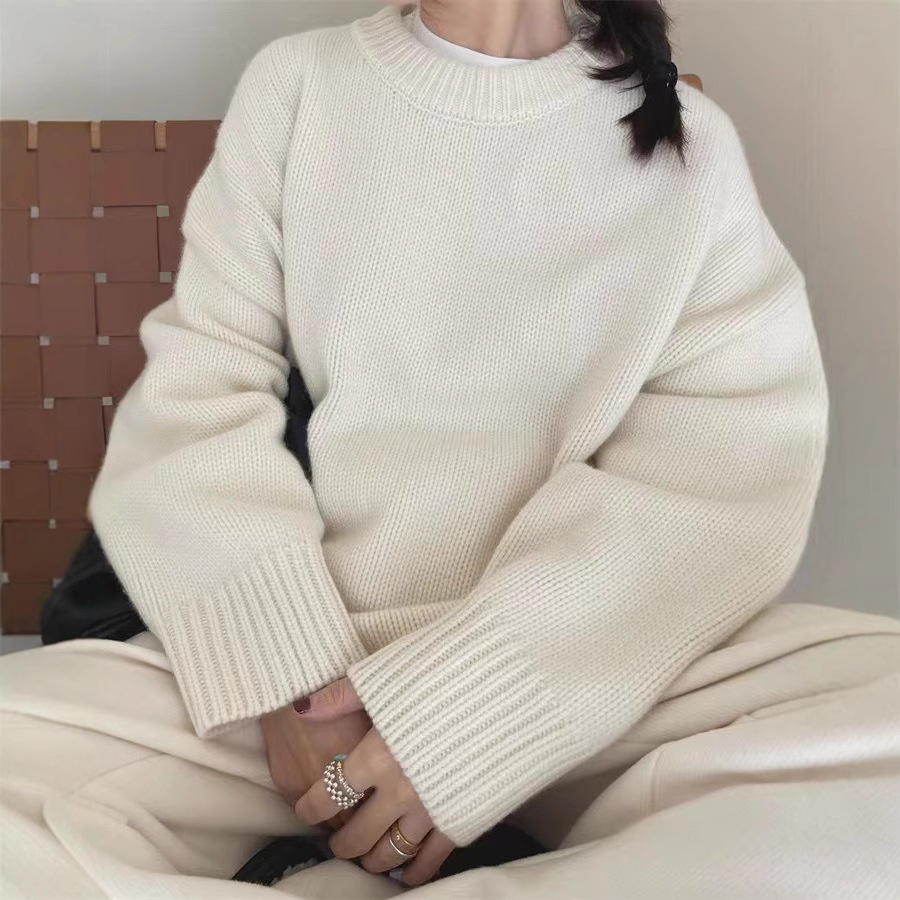 秋冬新款羊绒衫女灰色圆领套头针织慵懒羊毛宽松廓形加厚大码毛衣