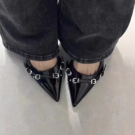 黑色高跟鞋女设计感小众气质名媛铆钉漆皮小猫跟一字扣带包头凉鞋