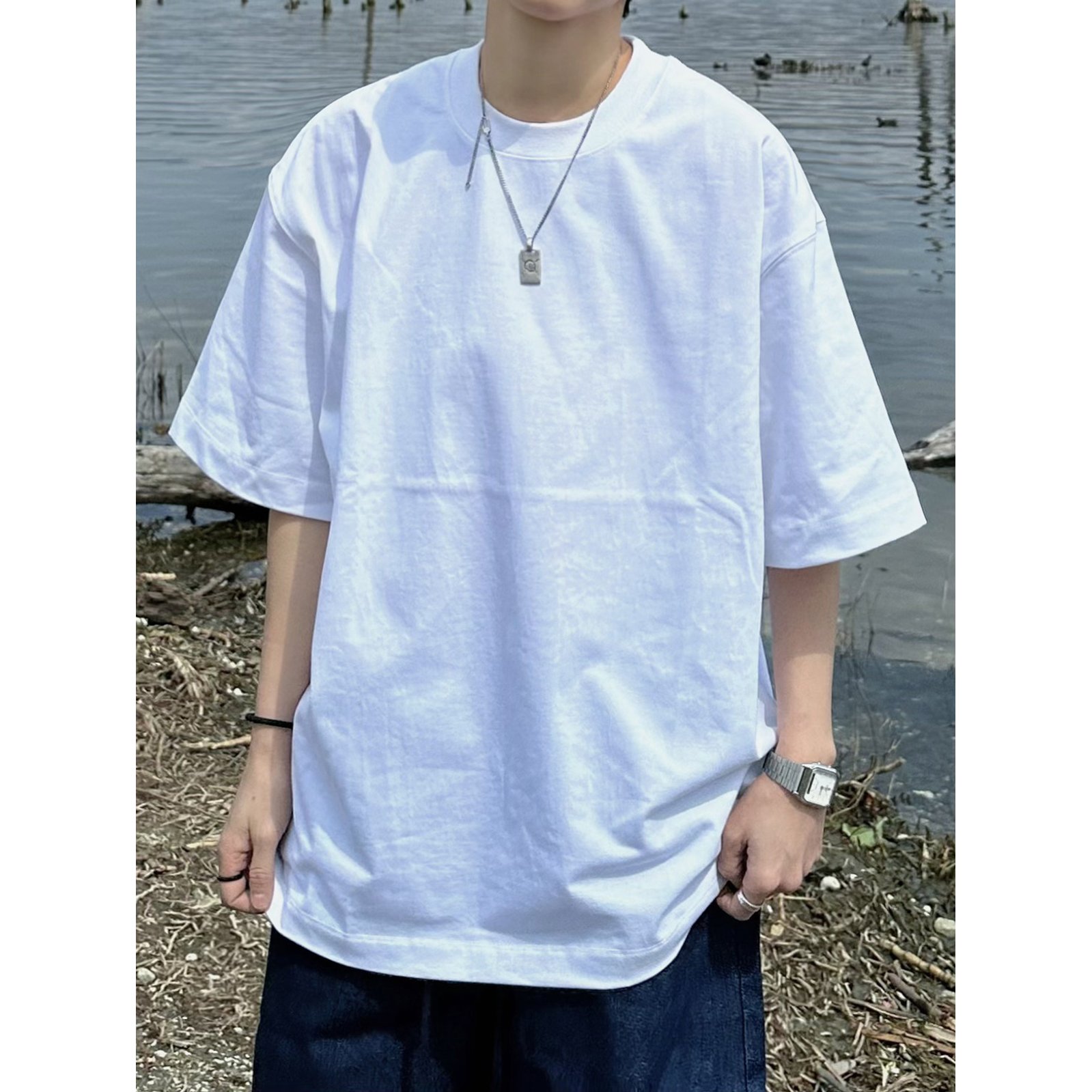 XBRO圆领重磅320G全棉宽松落肩小领口纯色短袖t恤男女五分袖打底