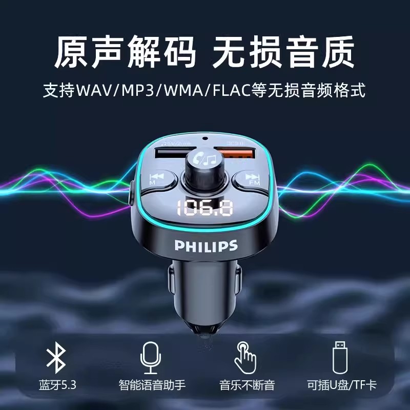 飞利浦新款车载蓝牙接收器mp3无损播放转换器汽车点烟器充电快充