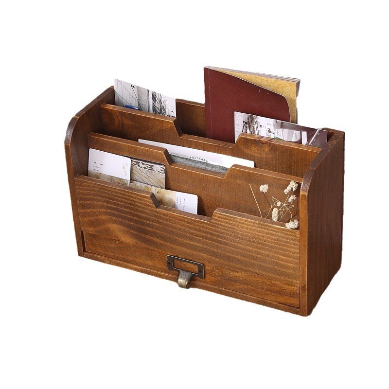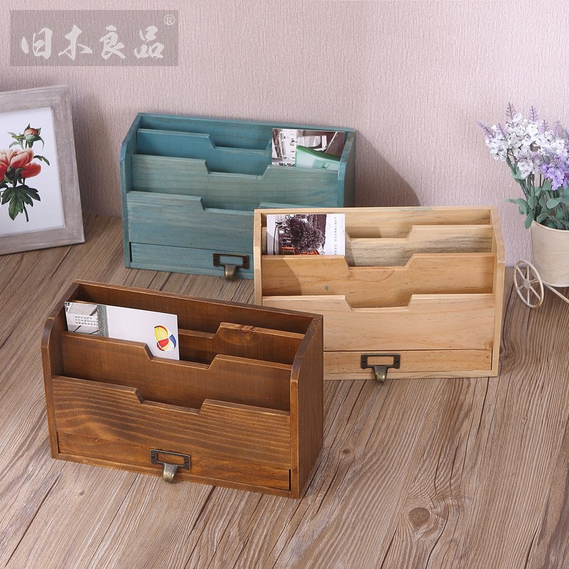 网红杂货复古木质桌面抽屉式收纳盒 办公用品文件整理盒储物木盒