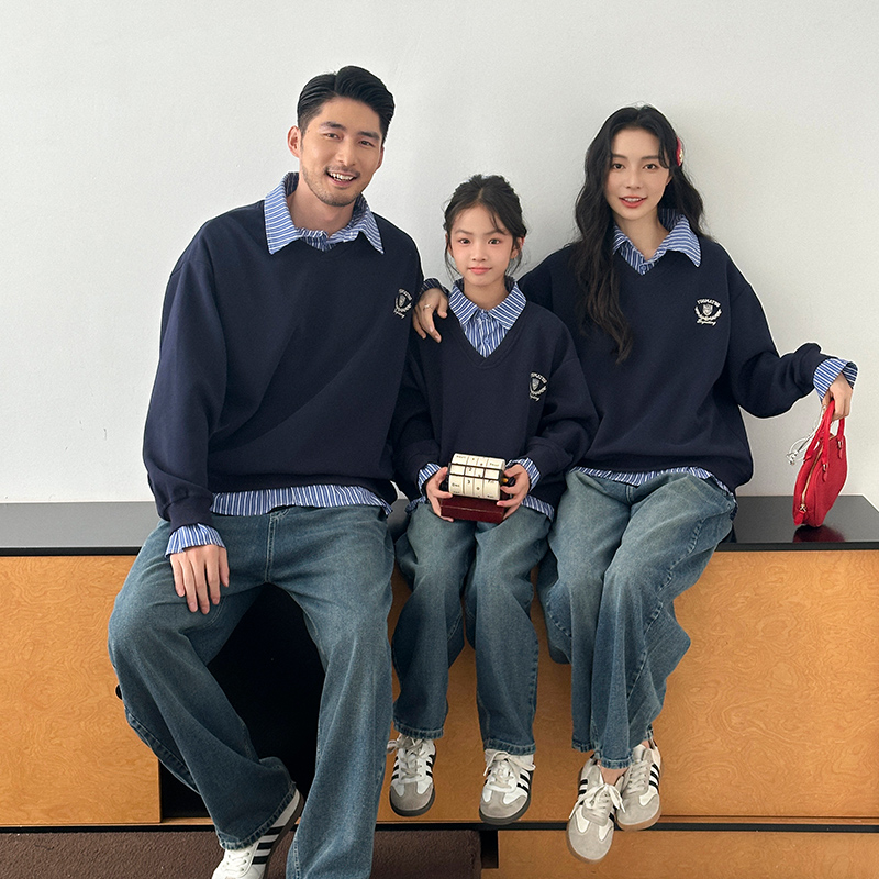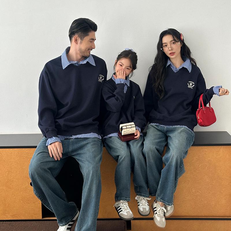 亲子装假两件套卫衣秋冬学院风衬衫领一家三四口上衣母子母女外套