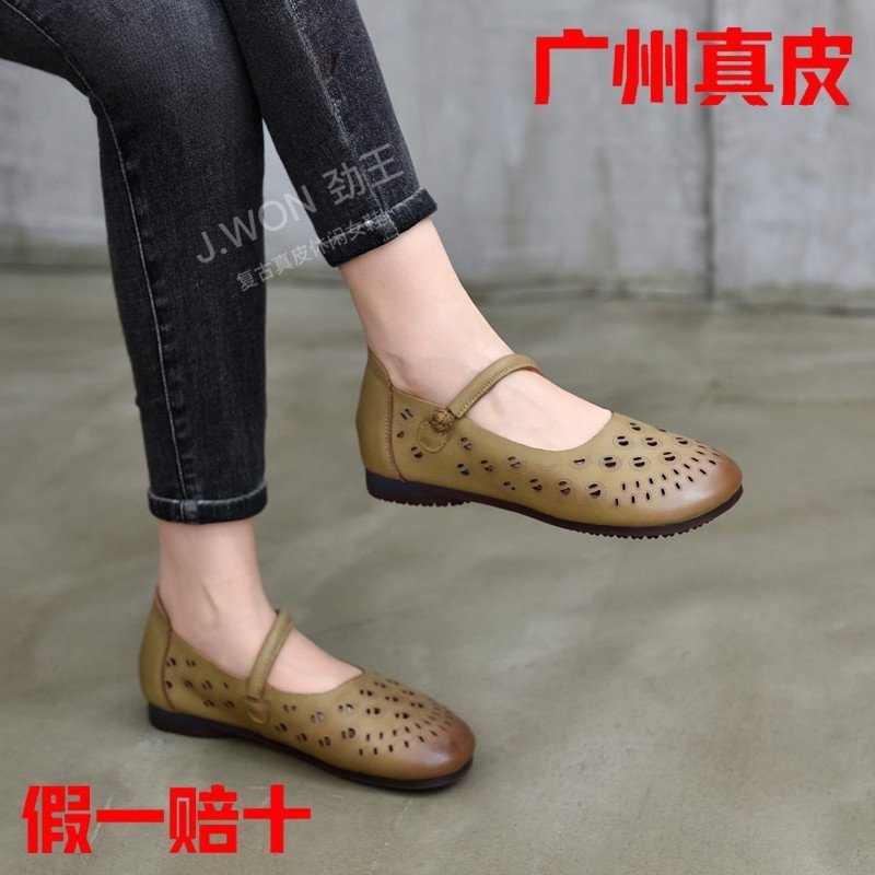 劲王真皮2025春夏新款镂空透气女士低跟一字扣带复古浅口百搭单鞋