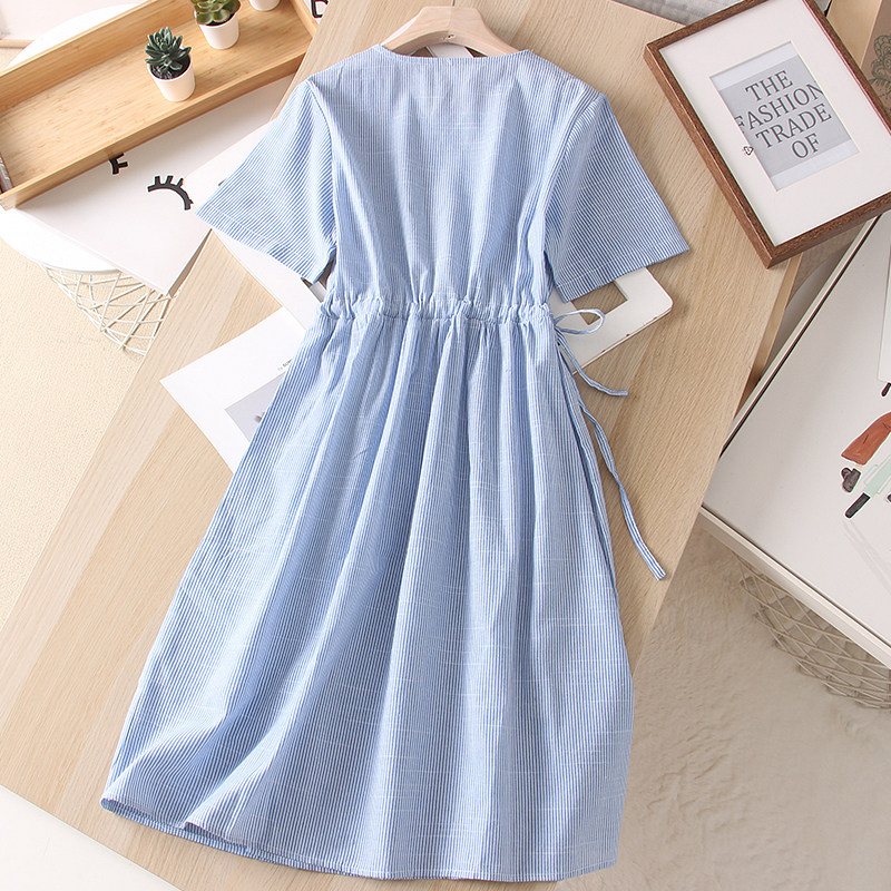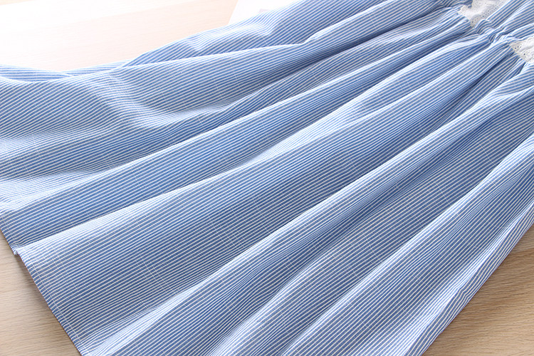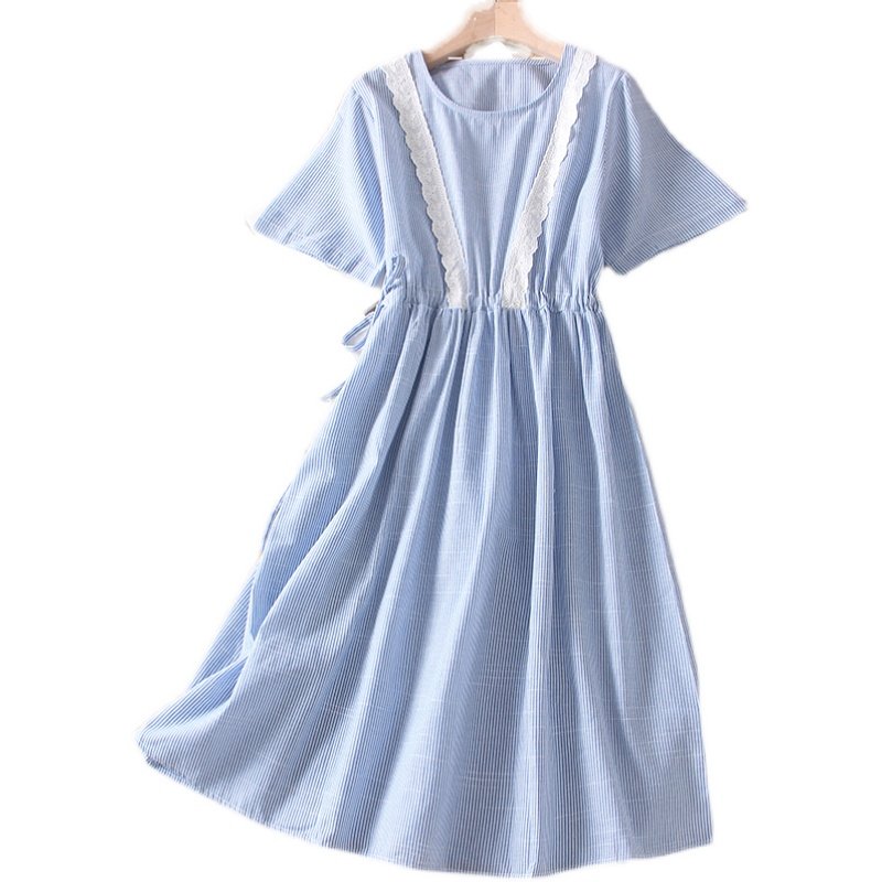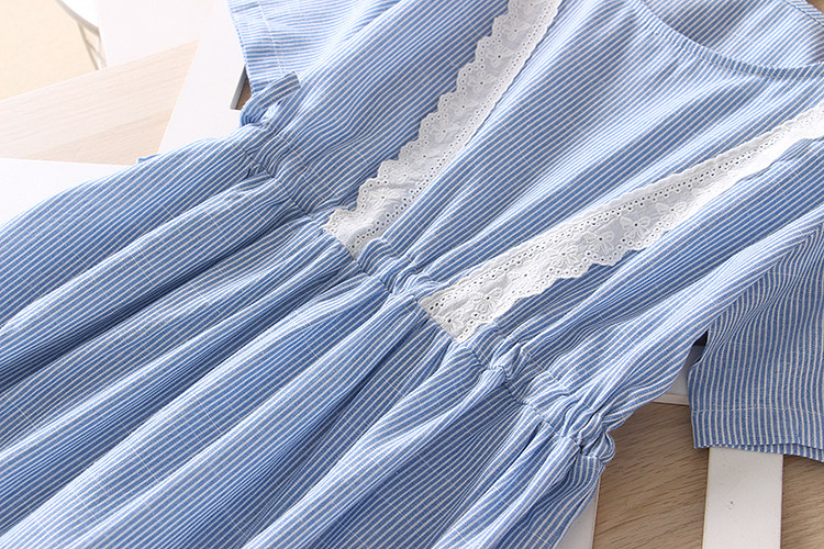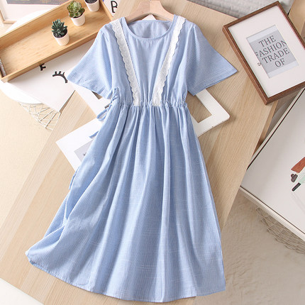 竖条纹蕾丝花边松紧腰连衣裙