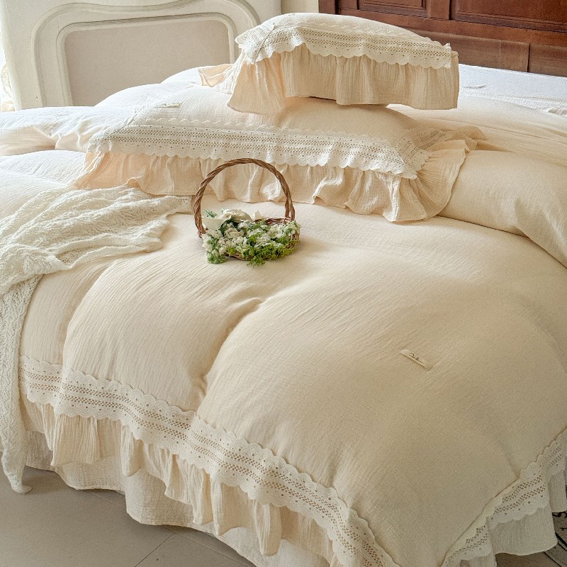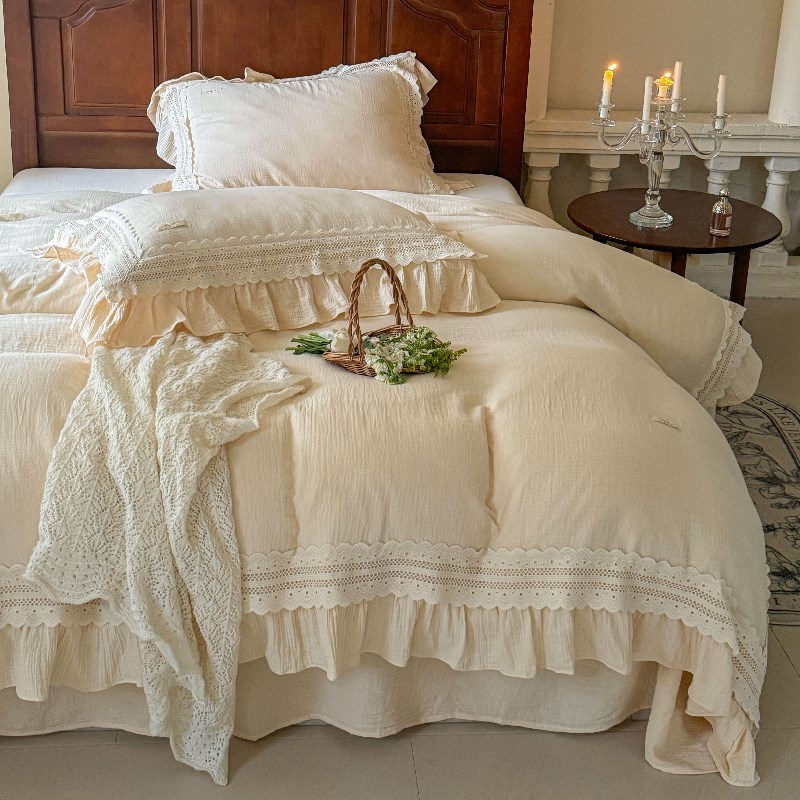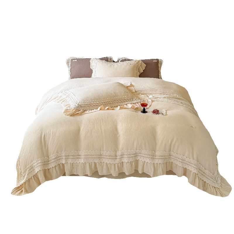 法式四件套刺绣蕾丝花边被套纯色床单全棉皱皱双层纱床上用品